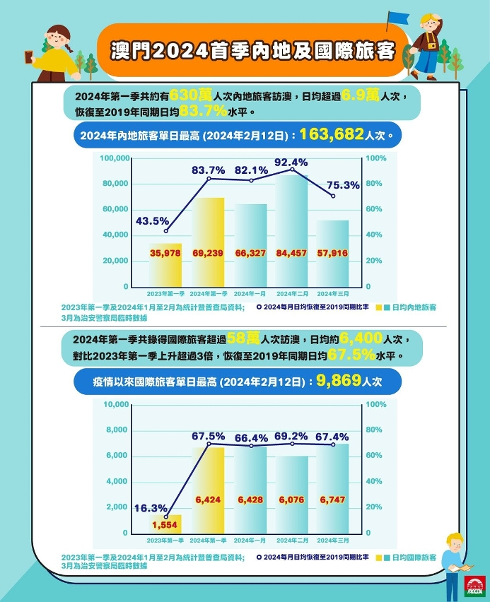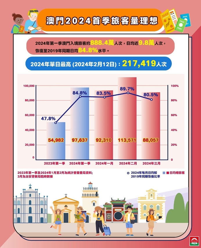 根據治安警察局臨時數據,2024年第一季澳門入境旅客約888.4萬人次,日均近9.8萬(97,637)人次,對比2023年第一季上升79.6%,恢復至2019年同期日均84.8%水平。其中,農曆新年年初三(2月12日)澳門入境旅客近22萬人次,錄得自有單日統計數據以來的第二高記錄。