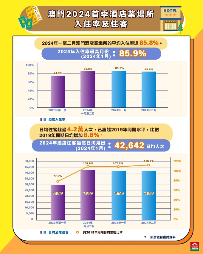 酒店業場所入住方面,根據統計暨普查局資料顯示,截至2 月底澳門有營業客房共有46,481間。一至二月酒店業場所的平均入住率亦達85.8%,日均住客超過4.2萬(42,505)人次,已超越2019年同期水平,比對2019年同期日均增加8.8%。