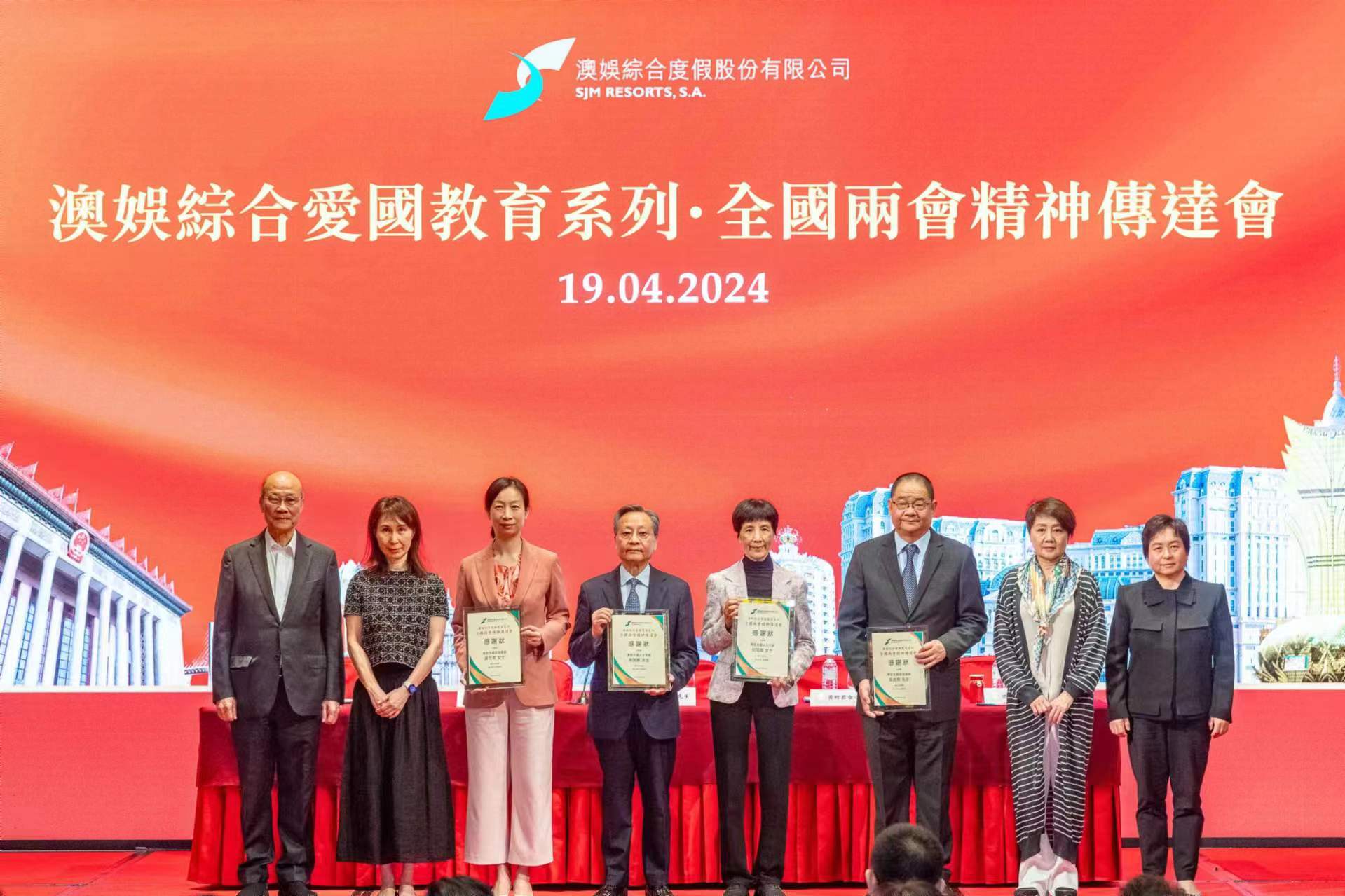 澳娛綜合常務董事何超鳳女士致歡迎辭時表示:「全國兩會上發表的政府工作報告肯定了特區在推動高質量發展的作用和地位,為澳門融入國家發展大局指明方向。通過深入學習兩會精神,我們將更好地配合特區政府,積極參與粵港澳大灣區和橫琴粵澳深度合作區的建設,助力開創具澳門特色的新質生產力,為鞏固和優化特區的競爭力、促進整體經濟增長,作出貢獻。」她續說:「澳娛綜合一體同心,秉持『愛國愛澳』的核心價值,堅定維護『一國兩制』實踐行穩致遠,共同說好中國故事。我們積極推行愛國教育,致力在團隊成員間以至在社區內厚植愛國情懷,尤其重視培養年輕一代,加強他們對中華優秀傳統文化的認同感和自豪感。」