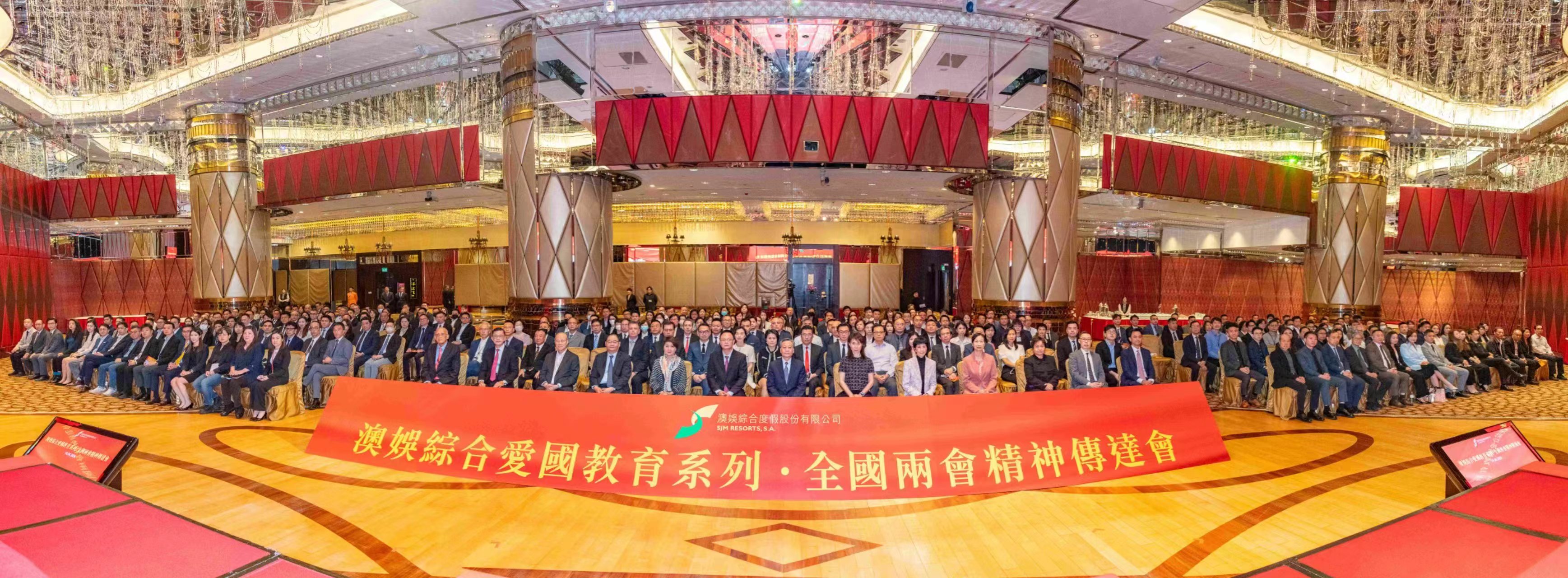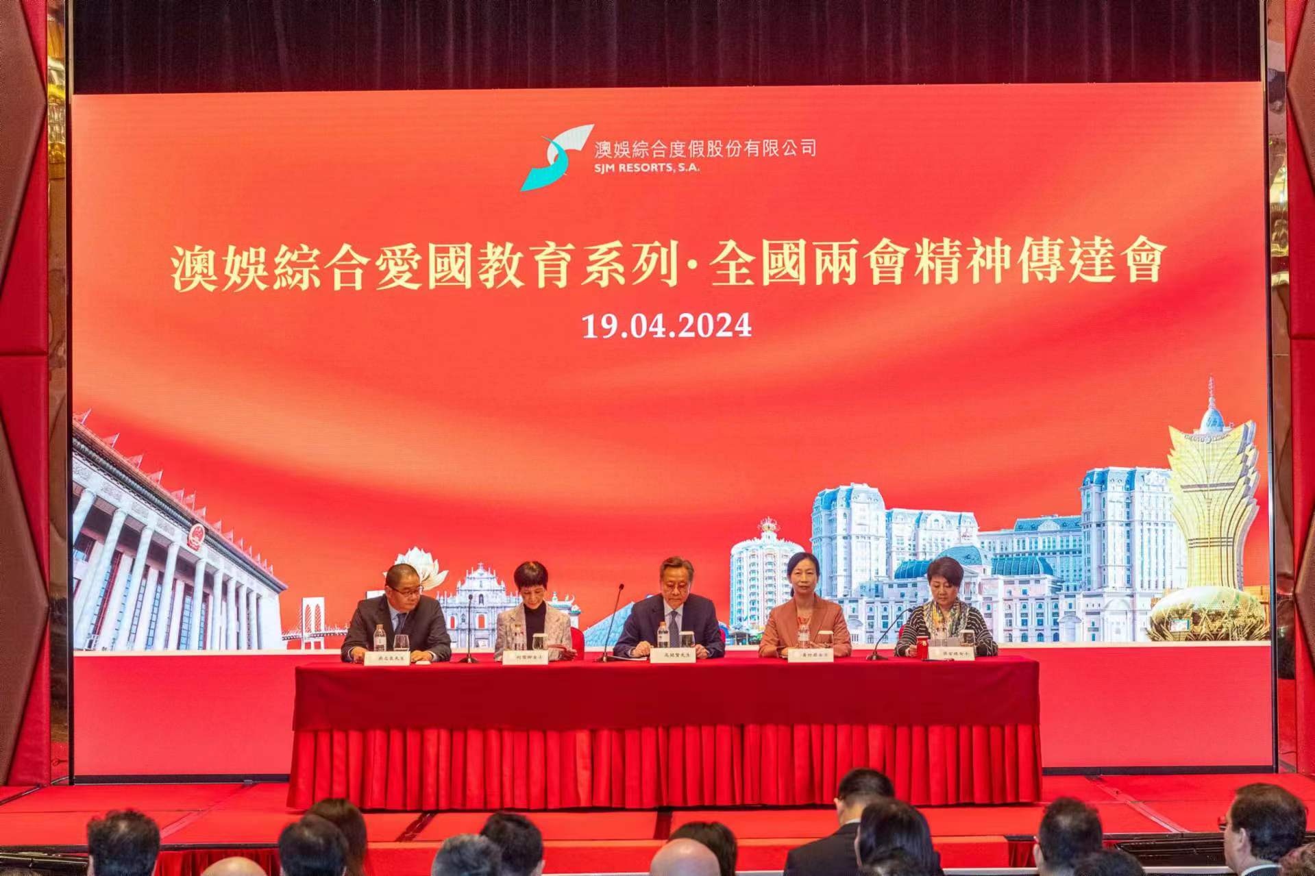 (澳門,2024年4月19日)澳娛綜合度假股份有限公司(「澳娛綜合」)心繫家國,一直致力向廣大市民及員工宣揚愛國愛澳精神,積極推行愛國教育。今天上午「澳娛綜合愛國教育系列.全國兩會精神傳達會」假澳門新葡京酒店宴會廳圓滿舉行,活動由中央人民政府駐澳門特別行政區聯絡辦公室經濟部副處長楊毅出席支持,邀請得全國人大常委會委員高開賢、澳區全國人大代表何雪卿、澳區全國政協委員黃竹君及澳區全國政協委員吳志良,向現場逾350位澳娛綜合員工傳達2024年全國兩會的重要內容和訊息。