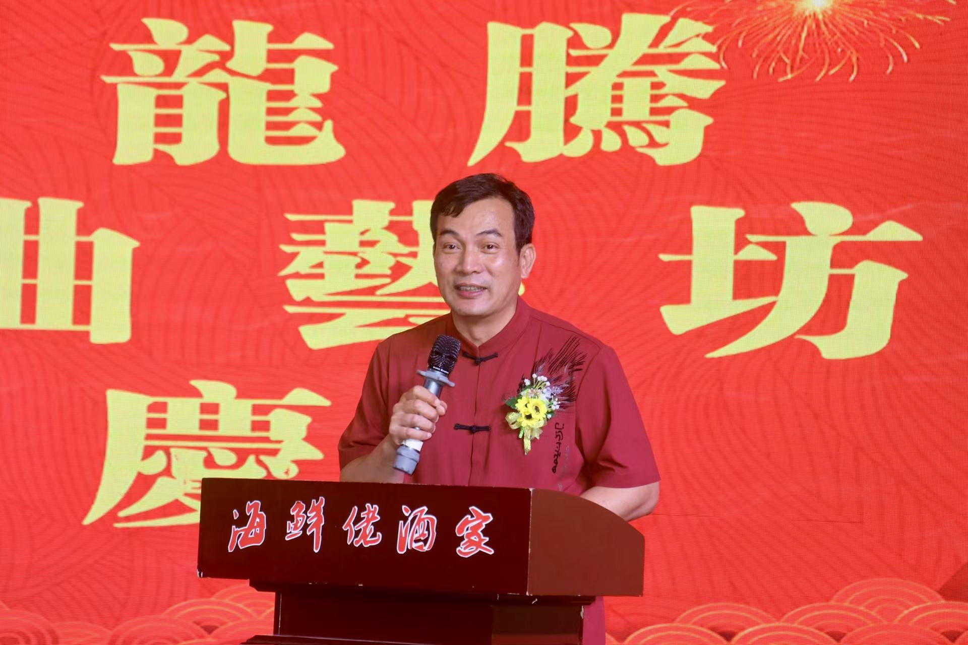 會長何飛龍在致辭中表示,龍騰樂坊成立的宗旨是為了推動和傳承粵劇曲藝文化,並在中山和珠海均設有活動基地,可更廣泛地開展各項工作,加強曲藝文化的交流活動,大力傳承推動曲藝文化發展,為曲藝事業注入新的活力。