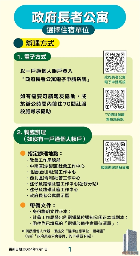【即時新聞】社會工作局自7月8日起分批安排合資格申請人選擇心儀的住宿單位,詳情可參考“政府長者公寓專頁”https://www.ias.gov.mo/government_elderly_apartments之“選擇單位資料”,基本情況如下: