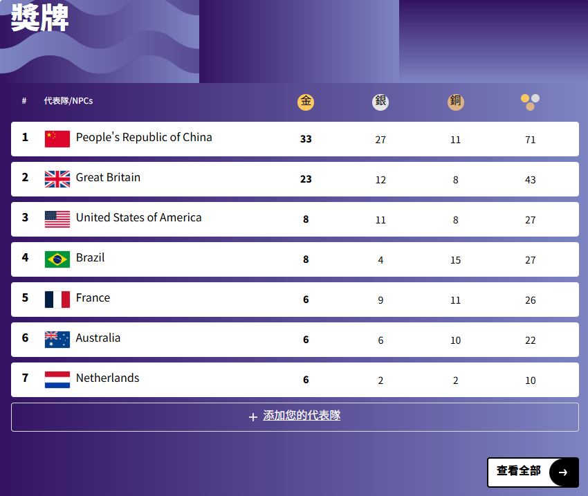 截至9月1日,中國以33金27銀11銅共71枚獎牌繼續穩居金牌和獎牌雙榜榜首。英國(23枚金牌43枚獎牌)仍居雙榜次席,美國、巴西(各有8金),法國、澳大利亞、荷蘭(各有6金)分別位居金牌榜的第三至第七位。