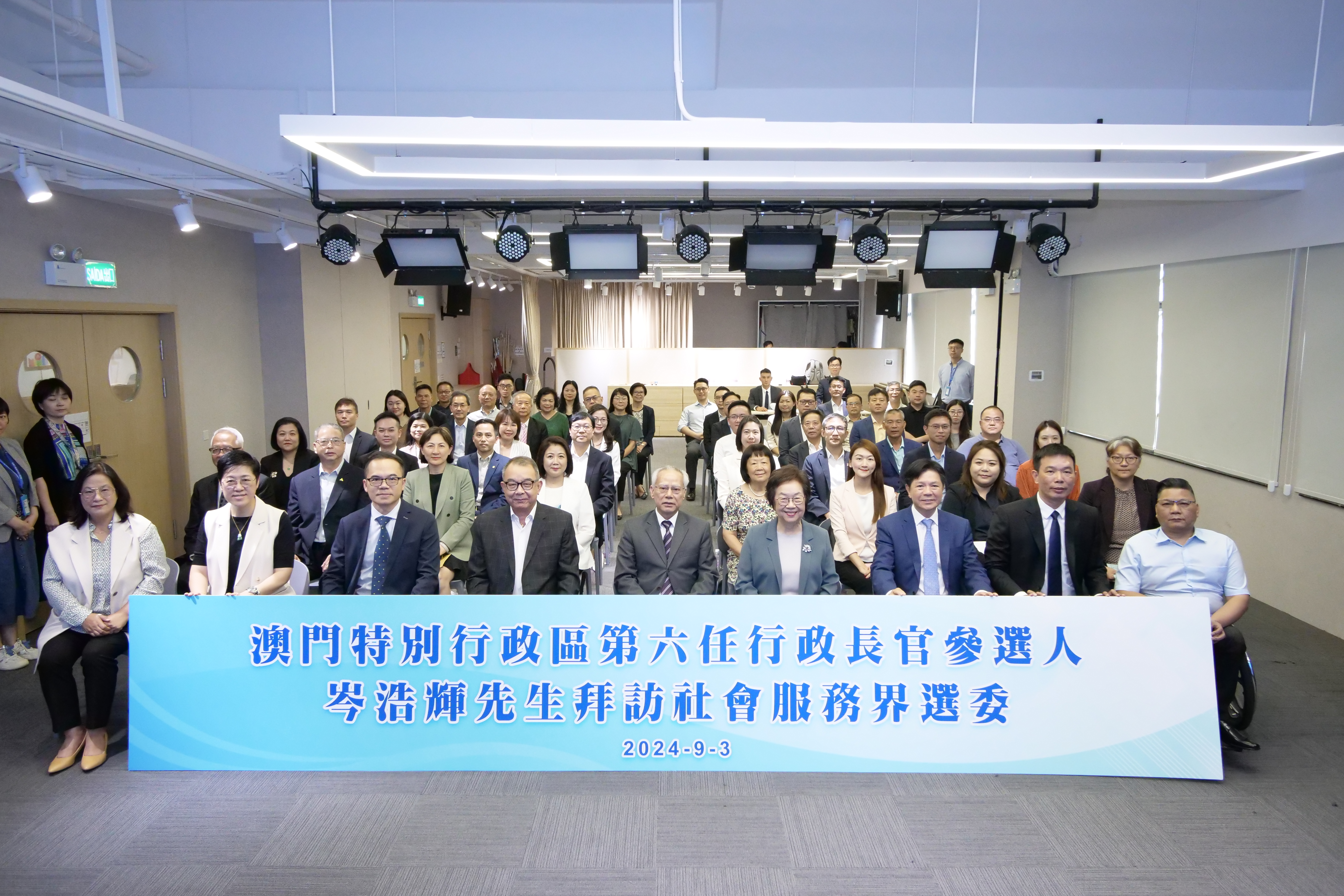 【即時新聞】第六任行政長官參選人岑浩輝在代理人李煥江,競選辦公室主任葉兆佳、副主任陳家良等陪同下,下午三時前往澳門街坊總會大樓拜會2024年行政長官選舉委員會社會服務界選委,爭取選委的支持並聽取他們的意見,了解澳門社會服務範疇的發展情況。