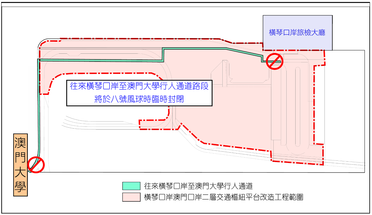另外,正在施工中的橫琴口岸澳門口岸區二層平台改造工程,經與治安警察局巡查後,當懸掛 8號烈風或暴風信號,將臨時封閉橫琴口岸通往澳門大學行人通道,並於解除8號風球一小時後重新開放,以保障行人安全。