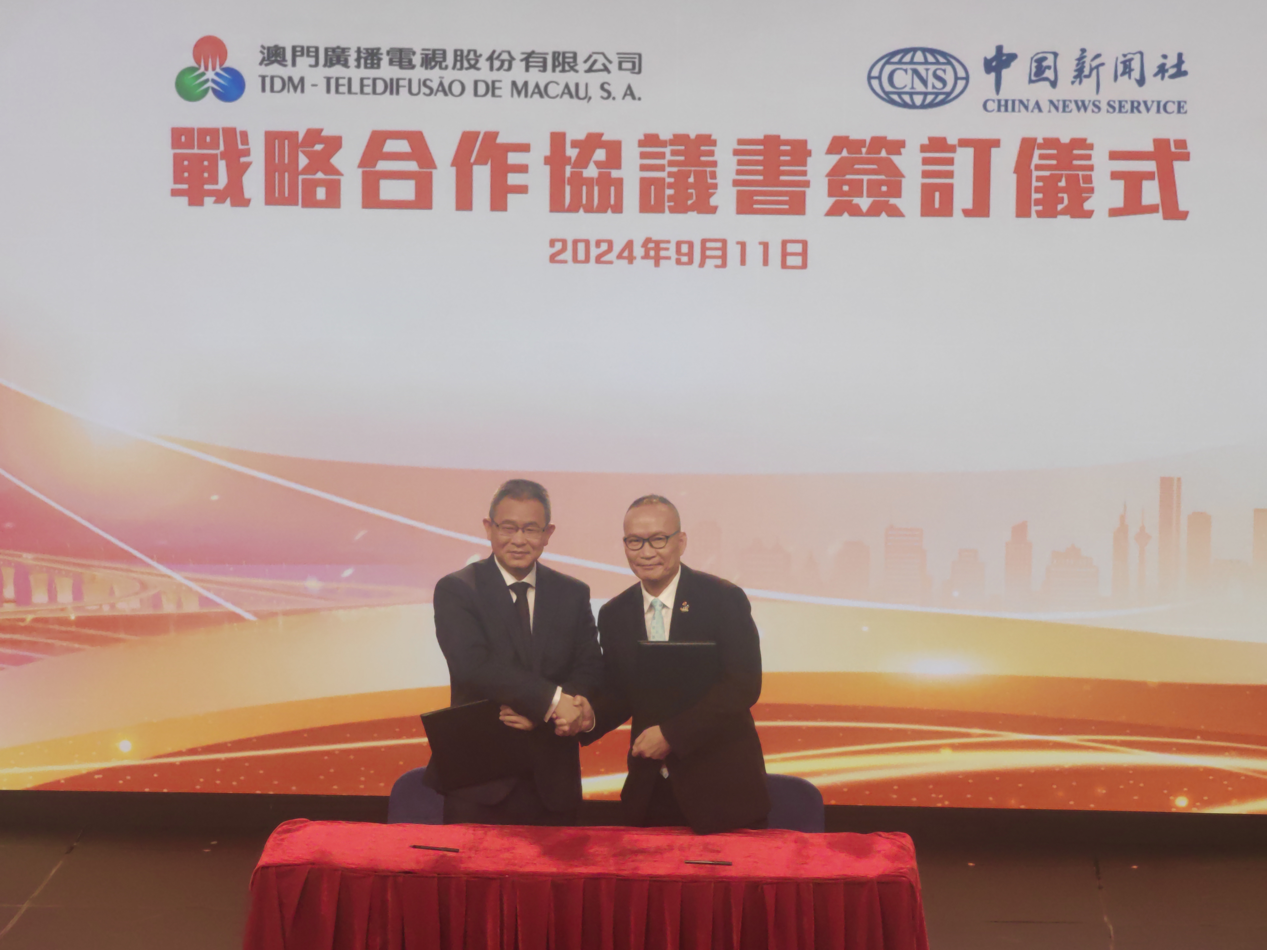 【即時新聞】中國新聞社(下簡稱中新社)與澳門廣播電視股份有限公司(下簡稱澳廣視)下午在澳廣視綜藝二館進行戰略合作協議簽訂儀式,此次戰略合作協議旨在促進雙方在內容創作、資源共享及技術交流等方面的深入合作,透過提升彼此在國際的傳播力及影響力,促進澳門地區及國家發展。