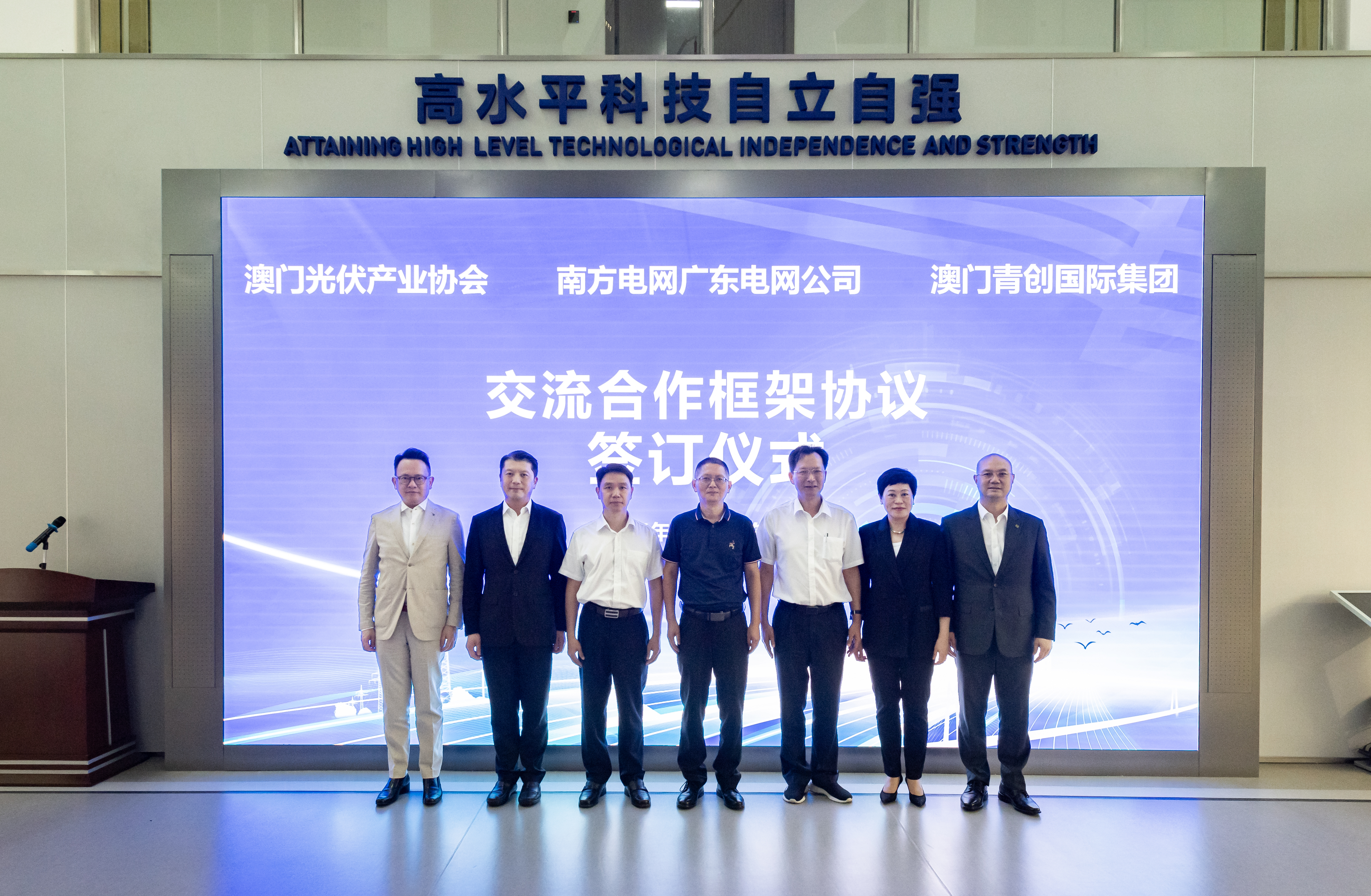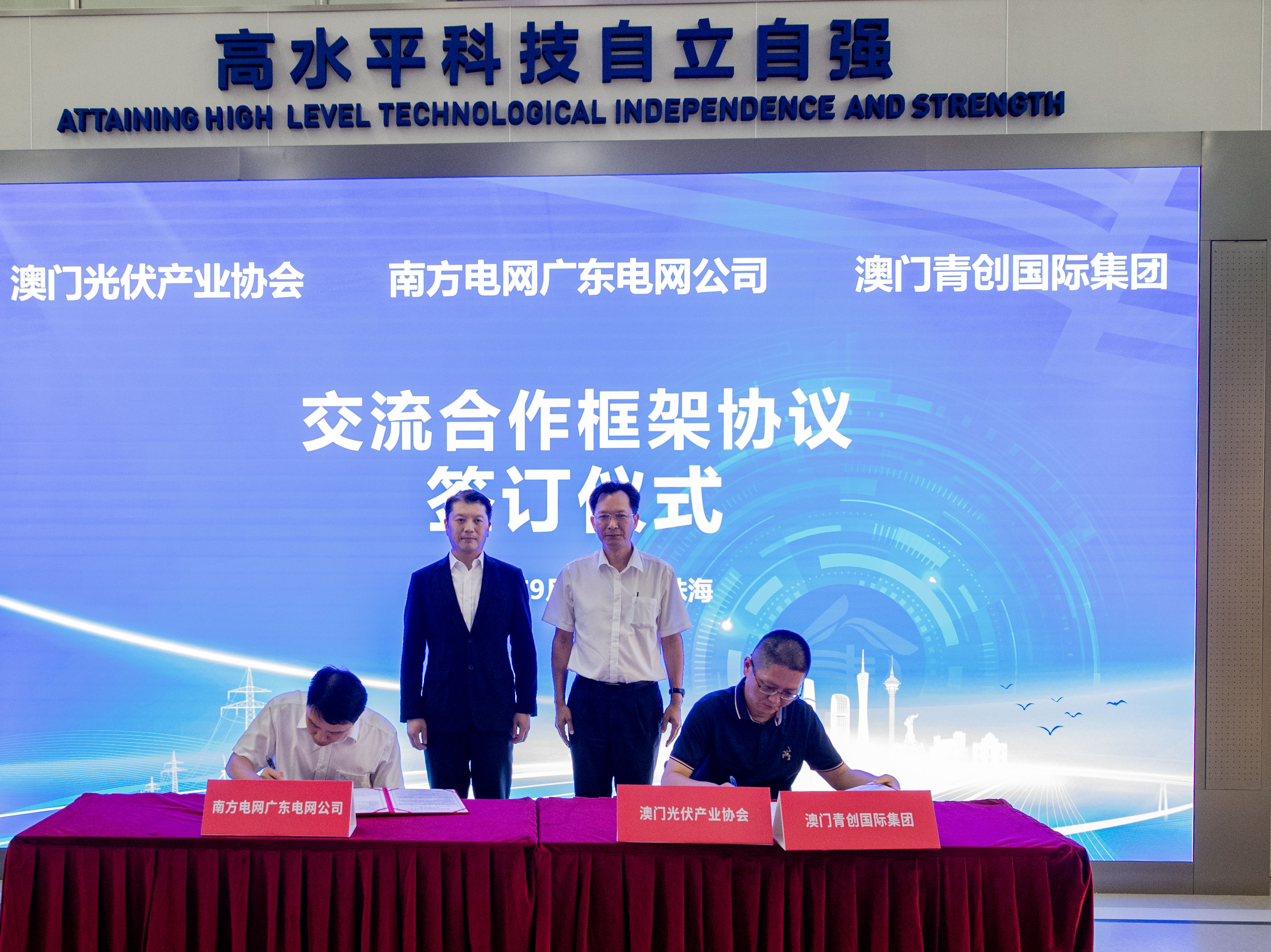 參觀結束後,澳門光伏產業協會、澳門青創國際集團與廣東電網橫琴數字零碳島共用實驗室負責人在來訪嘉賓的見證下正式簽訂了戰略合作協定。雙方將圍繞技術創新、人才培養、項目實施、政策宣導、國際發展等方面全面開展合作,融通產業,支援粵澳青年創新創業,打造能源合作新生態。