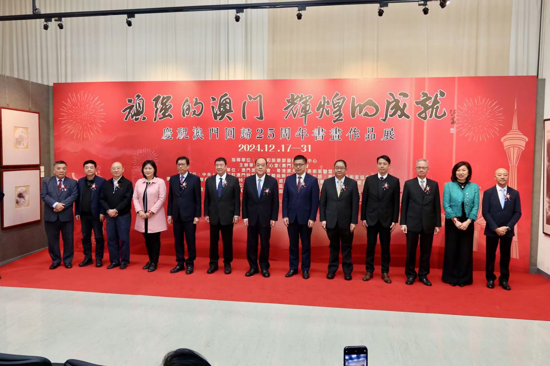 展覽開幕儀式傍晚6時半舉行,行政長官賀一誠,中聯辦宣傳文化部部長萬速成,全國政協常委廖澤雲,澳區全國人大代表黃顯輝,澳門基金會行政委員會主席吳志良,永利澳門有限公司總裁、董事會副主席兼執行董事陳志玲,粵港澳大灣區美術家聯盟主席汪曉曙,廣東省美術家協會副主席、澳門文化界聯合總會美術家專委會主任劉富業等出席主禮。