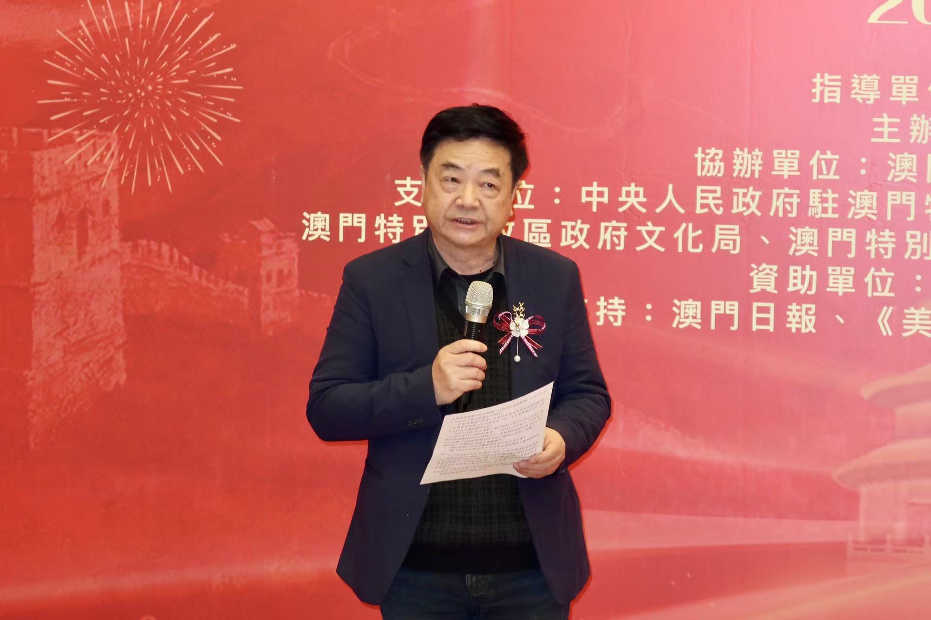 劉富業致辭表示,賞心堂(澳門)書畫會長期以來不懈努力,默默奉獻於澳門的文化事業。過去在澳門回歸一周年、五周年、十周年、十五周年及二十周年均舉辦過大型展覽,以及均邀請時任行政長官主禮,為澳門的文化繁榮添上濃墨重彩的一筆。值慶祝澳門回歸二十五周年大型展覽之際,再次獲行政長官賀一誠出席與主禮,倍感榮幸。同時感謝遠道而來參展的藝術家們,包括來自新疆的薛雲祥、來自首都北京及粵港澳大灣區多個城市的藝術家等,豐富了展覽的內涵,協力促進文化藝術的交流與融合。展望未來,賞心堂將繼續秉持初心,砥礪前行,為澳門的文化事業貢獻更多力量。