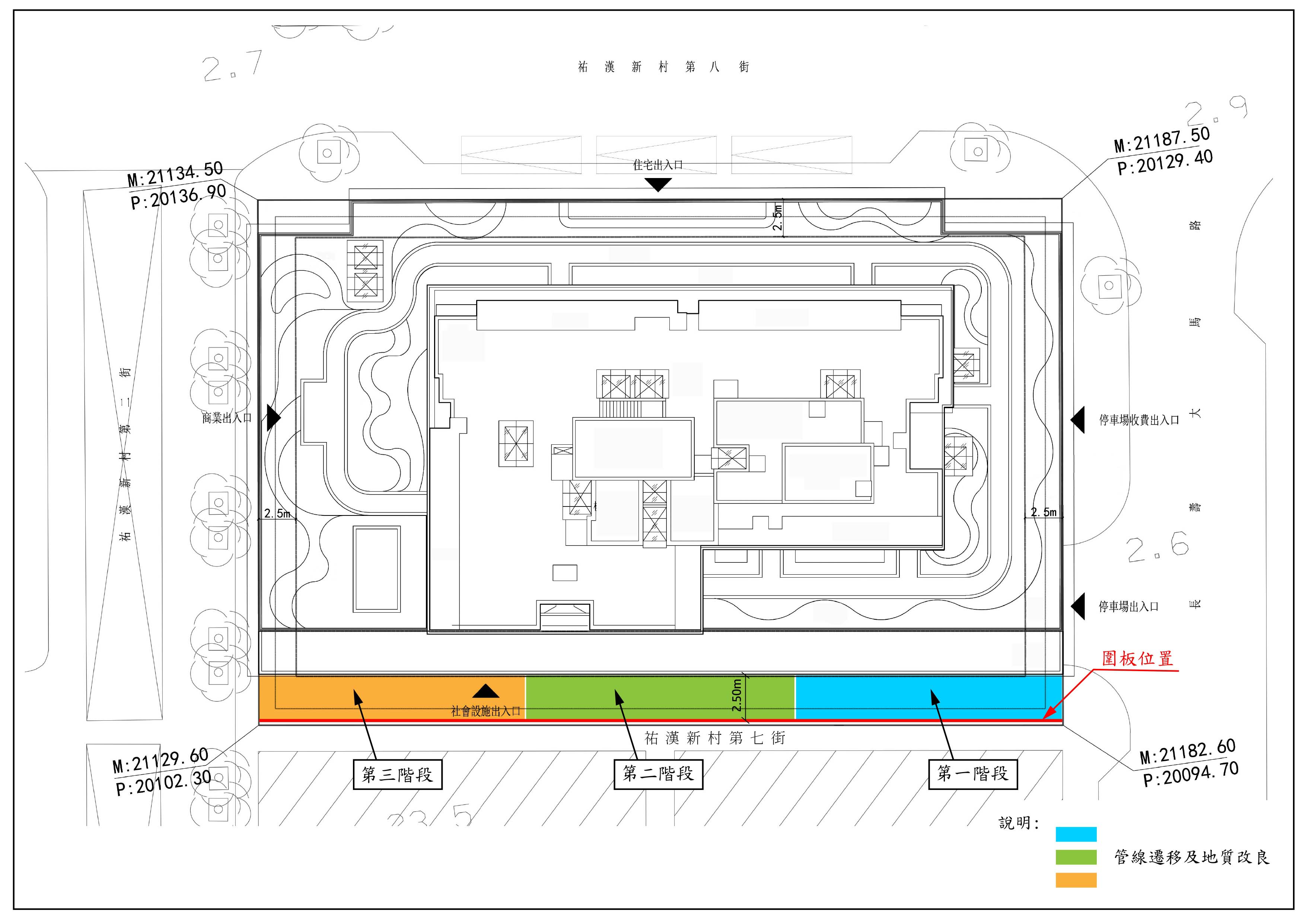 由於夾心房屋項目範圍毗鄰區內樓齡較大的樓宇,為確保施工過程中周邊建築物的安全,公共建設局將於靠近順利樓一側的祐漢新村第七街佔用對開約2.5米的範圍設置圍板,以便進行管線遷移及土質改良施工。