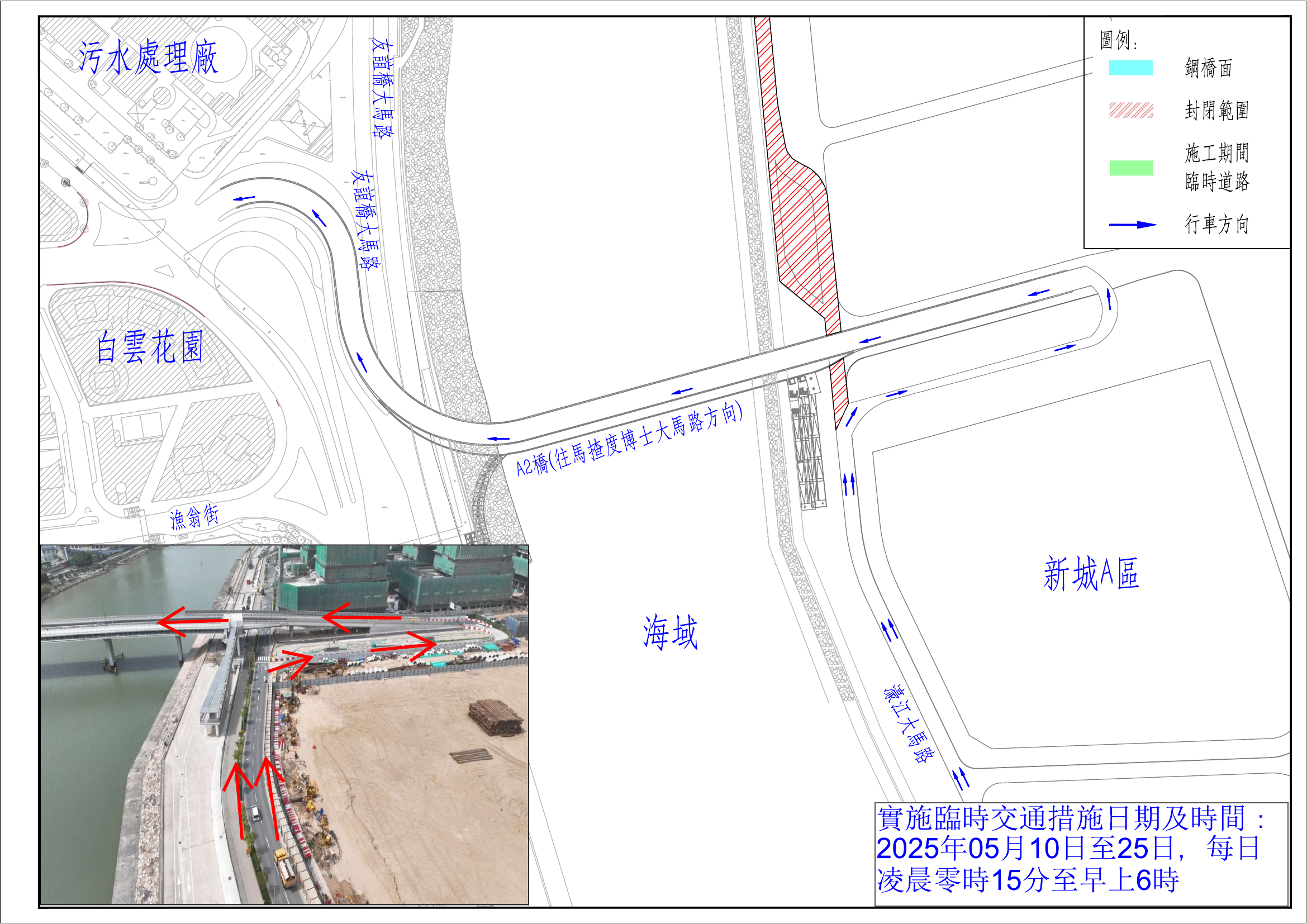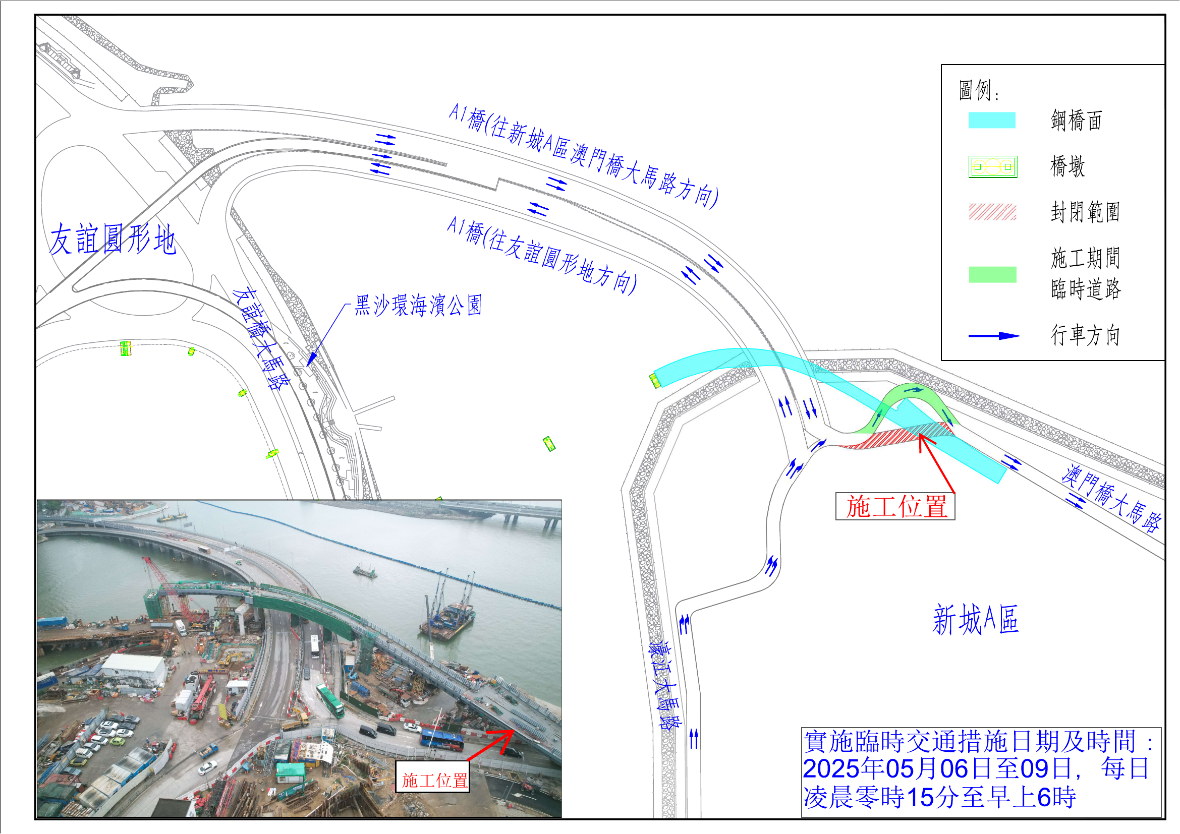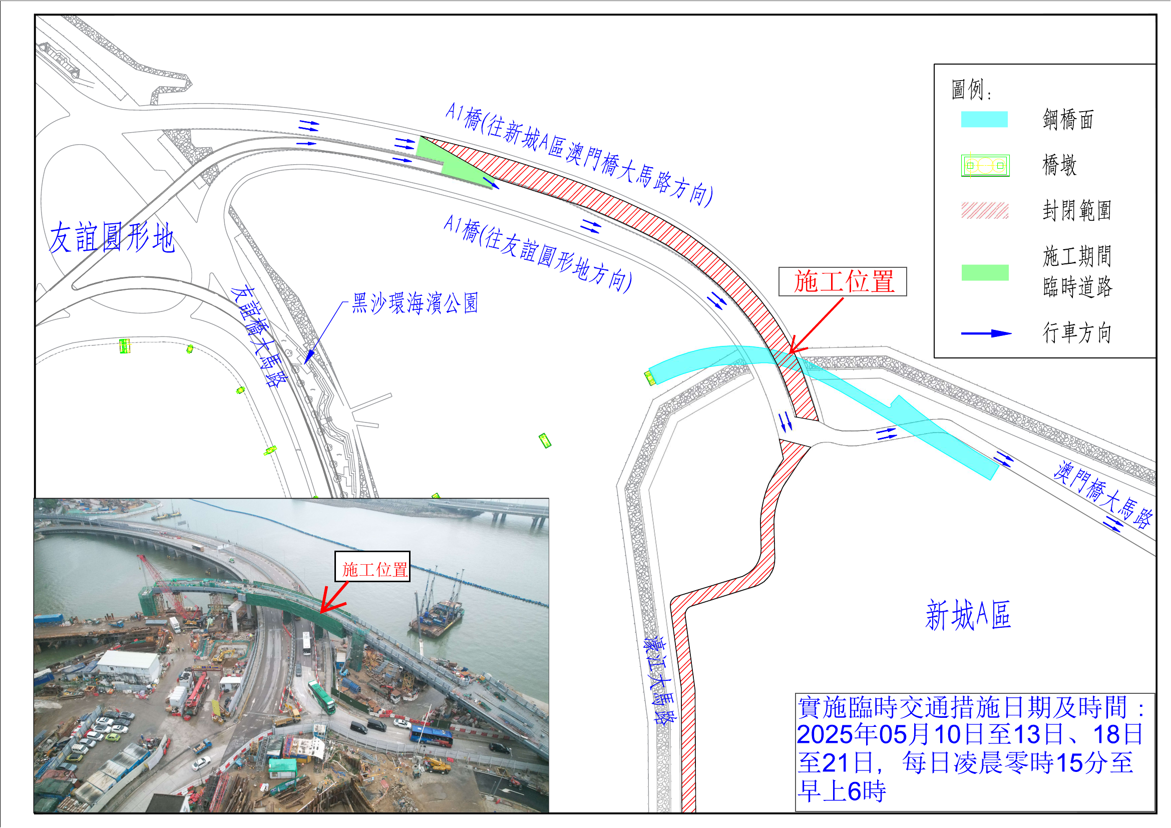 臨時交通措施將於每晚凌晨零時15分至上午6時實施,其中由本月6日至9日,A1橋維持行車路線不變,車輛駛至A1橋橋頭需經臨時道路左轉進入澳門橋大馬路。而在本月10日至13日、18日至21日,A1橋往新城A區方向部分路段封閉,A1橋往友誼圓形地反方向行車;由新城A區前往黑沙環區之車輛,僅可經濠江大馬路取道A2橋前往馬揸度博士大馬路。本月14日至17日、22日至25日,A1橋往A區澳門橋大馬路方向行車路線不變,但A1橋往友誼圓形地方向實施封閉交通,車輛僅可經濠江大馬路取道A2橋前往馬揸度博士大馬路。
