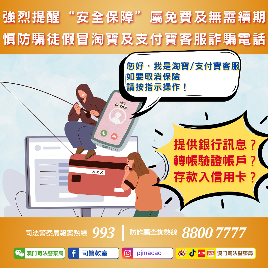 【即時新聞】今年本澳出現假冒“淘寶”或“支付寶”客服的電話詐騙案件後,司警局於上半年已先後三次採取行動,成功搗破相關犯罪窩點。然而,該類詐騙手法近期再度出現,局方於8月中發出警情通告,提醒市民提高警惕。