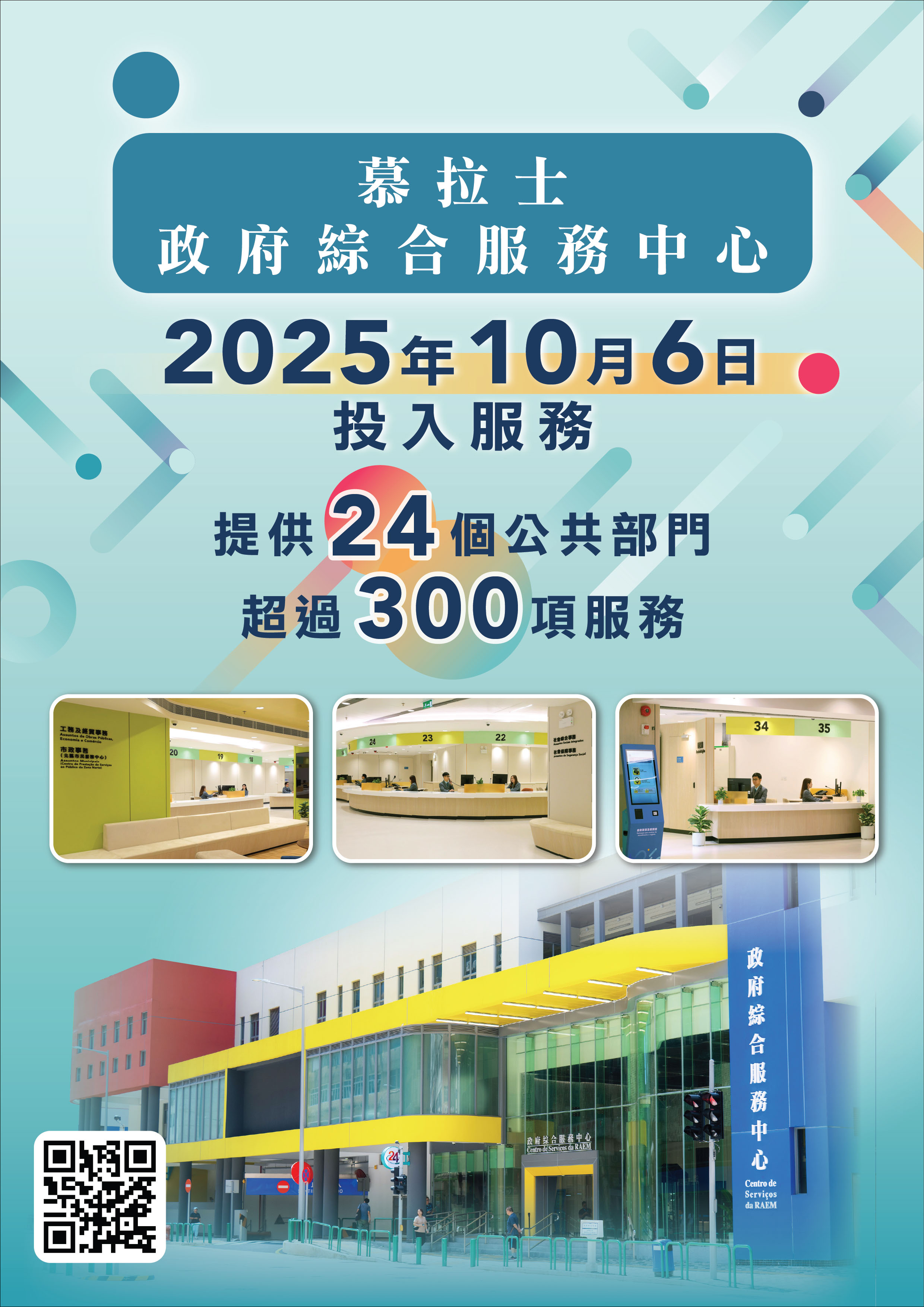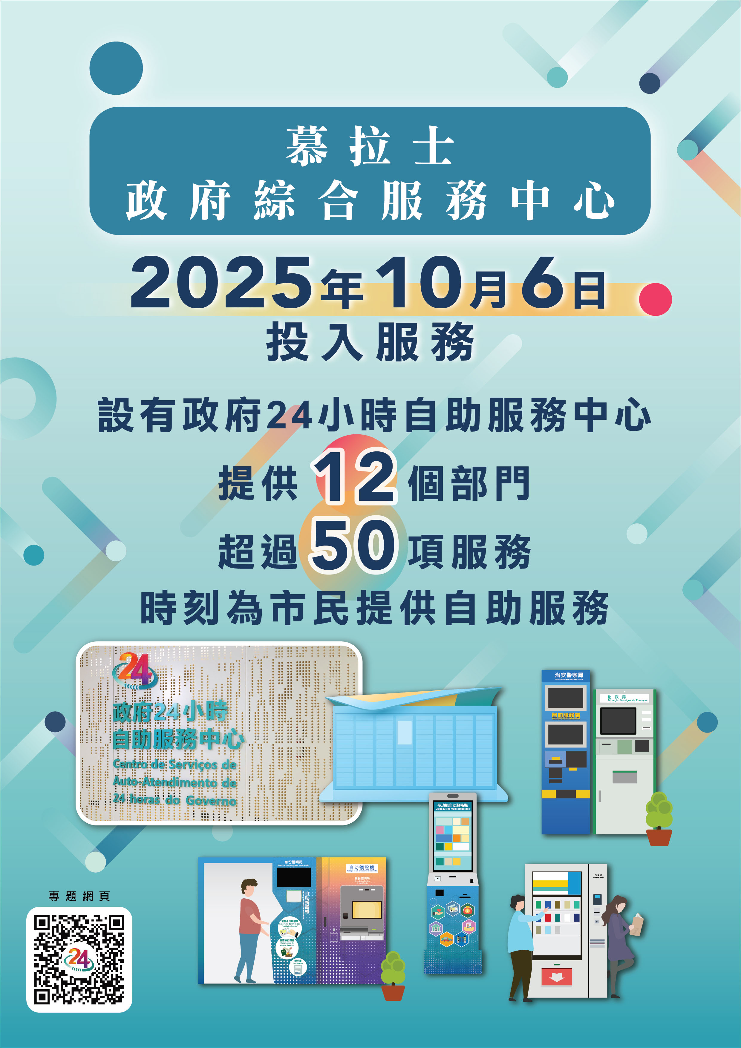 慕拉士政府綜合服務中心進一步強化自助及跨境服務,擴大政府24小時自助服務中心規模,提供逾50項不同政府部門的自助服務,並新增“跨境自助服務專區”,設廣東省“粵智助”及橫琴“商事通”自助服務機,方便居民及企業辦理包括養老、就業、稅務、交通、安居等合共超過170項常用服務。