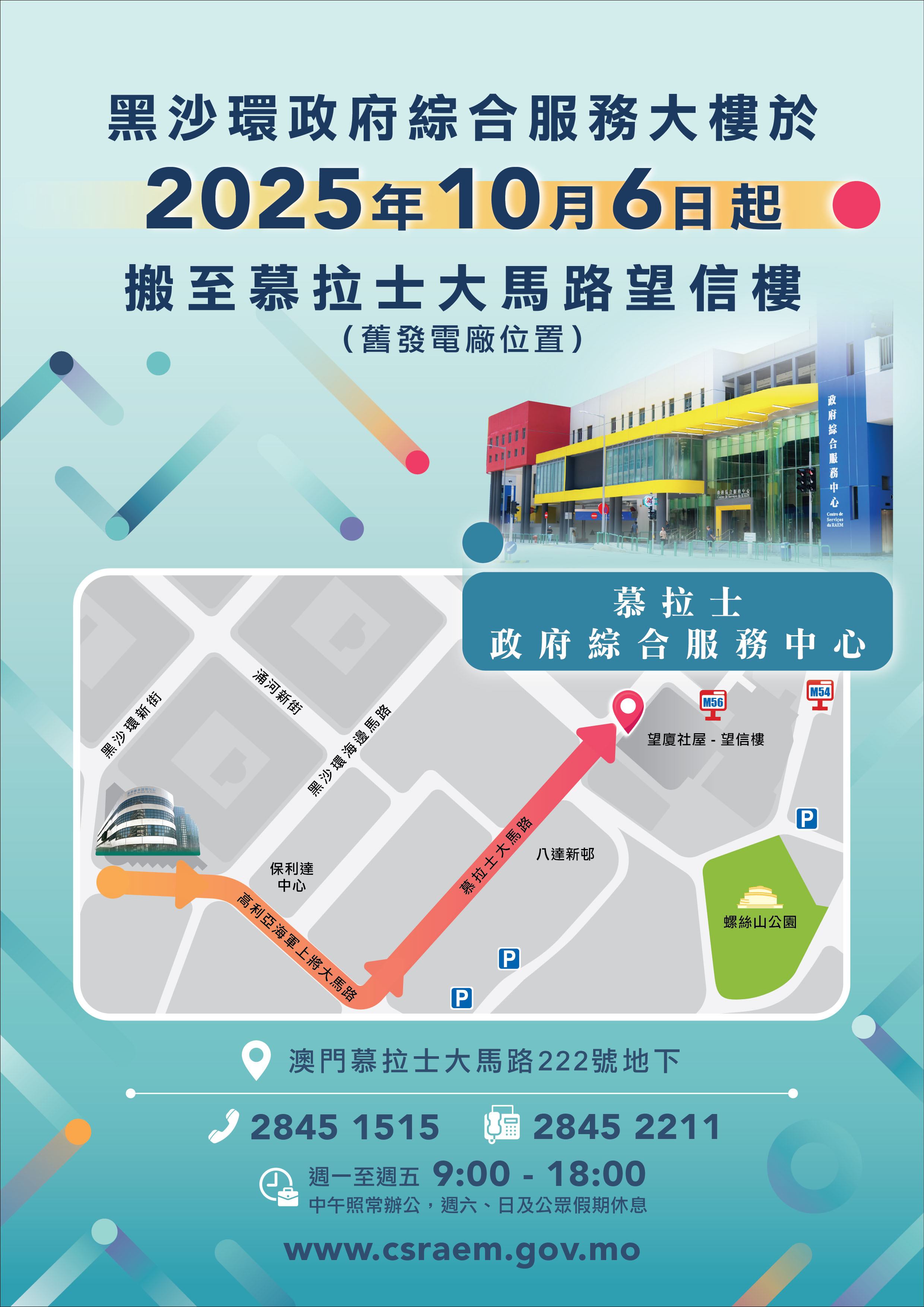【即時新聞】為向市民提供更便捷、優質的服務,位於澳門黑沙環新街52號的政府綜合服務大樓,將於10月6日起搬至慕拉士大馬路望信樓(即舊發電廠位置)地下,以更舒適的環境繼續為市民服務。