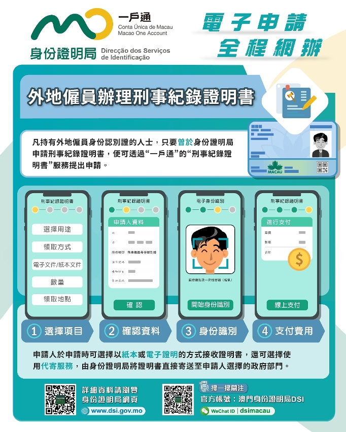 【即時新聞】為持續優化民生服務,積極回應市民網上辦證的需求,身份證明局今(30日)起在“一戶通”新增外地僱員辦理刑事紀錄證明書的服務,方便外地僱員可全程網上申領刑事紀錄證明書,減少親臨辦理,達致簡政便民的目的。