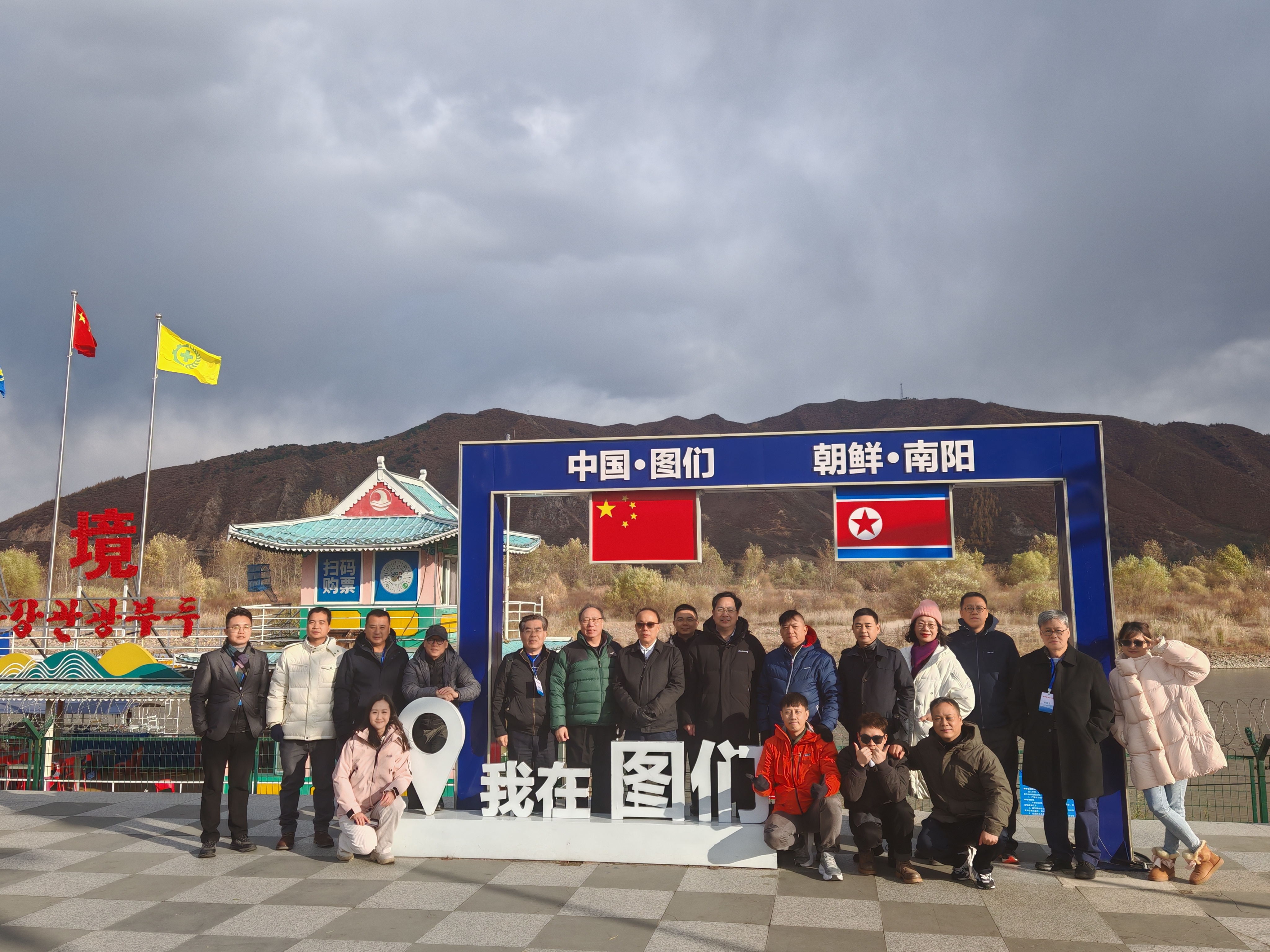 一行首先參觀中朝邊境標誌性景點圖們江廣場,感受邊疆的重要性和民族團結的意義。站在沿江而建的圖們江87街區觀景台上,眾團員紛紛駐足拍照,打卡87號界碑以及對岸朝鮮南陽市的自然風光與人文景觀。