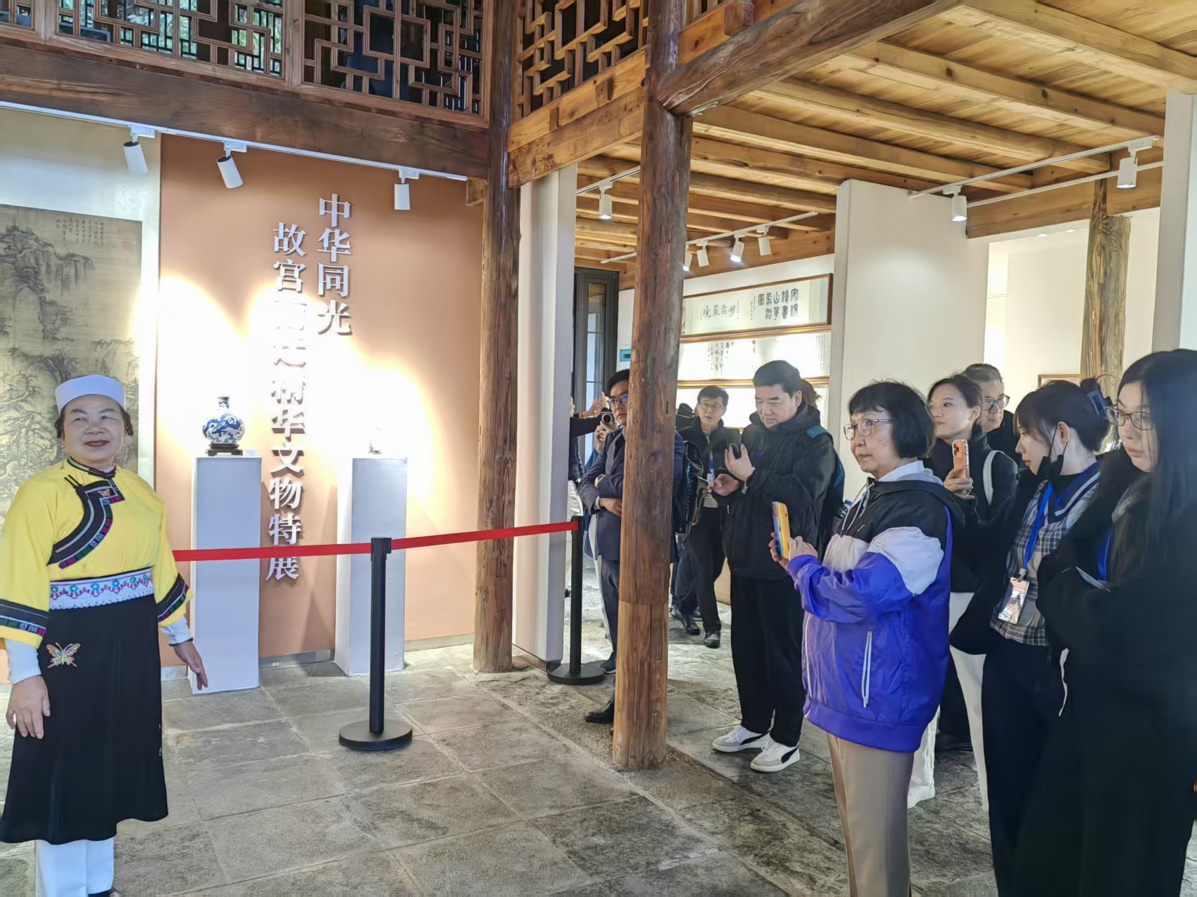 舊州古鎮早上細雨如絲,華文媒體代表團漫步在濕潤的青石板街上,道路兩側一排排保存上百年的老屋展現出別樣韻味,團員不僅品嘗當地特色美食,更在閒適悠揚的田園氛圍中感受傳統文化與現代旅遊的有機融合。恰逢「2025·多彩貴州第十八屆中國原生態國際攝影大展」在古鎮內展出,團員徜徉其間,既欣賞攝影作品,亦走訪西秀區紅色愛國教育基地老公社,參觀「中華同光——南遷文物『安順駐留地』特展」。展廳內的珍貴圖片與文獻資料,猶如打開一扇歷史之門,生動再現抗戰時期故宮文物南遷的艱辛歷程,以及安順民眾在保護國家文脈中作出的重要貢獻,讓團員深切領略屯堡文化的深厚底蘊與紅色文化的精神內核。