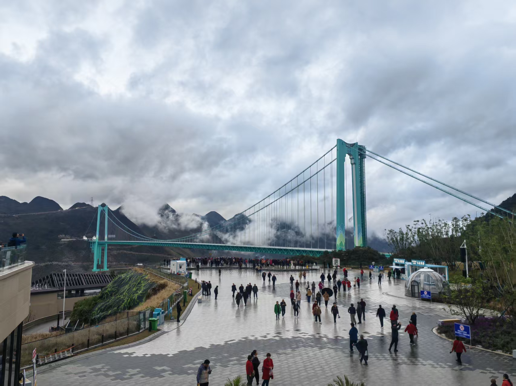 午後,華文媒體代表團抵達旅遊打卡熱點貴州六盤水花江峽谷大橋,實地探訪這座創下兩項世界紀錄的超級工程。據介紹,該橋全長2890米,主橋跨徑1420米,橋面至水面高度達625米,既是全球跨徑最大的山區橋樑,亦是當今世界最高橋樑。建設過程中,項目團隊創新運用無人機引線、BIM建模、北斗導航等智慧技術,研發高性能鍛焊組合式索鞍結構,成功攻克峽谷風場複雜、地形險峻、施工難度大等多重難題,實現極端條件下的工程技術突破。這座於9月28日通車的大橋,不僅大幅縮短關嶺與貞豐兩地的通行時間,更活躍地區經濟,吸引眾多遊客前往,帶動交通、旅遊業、觀光等各類文旅項目發展,為貴州「橋旅融合」開闢全新路徑。雄偉壯觀的橋梁與壯麗的峽谷風光相映成趣,讓華文媒體代表團成員對中國基建實力稱贊不已。