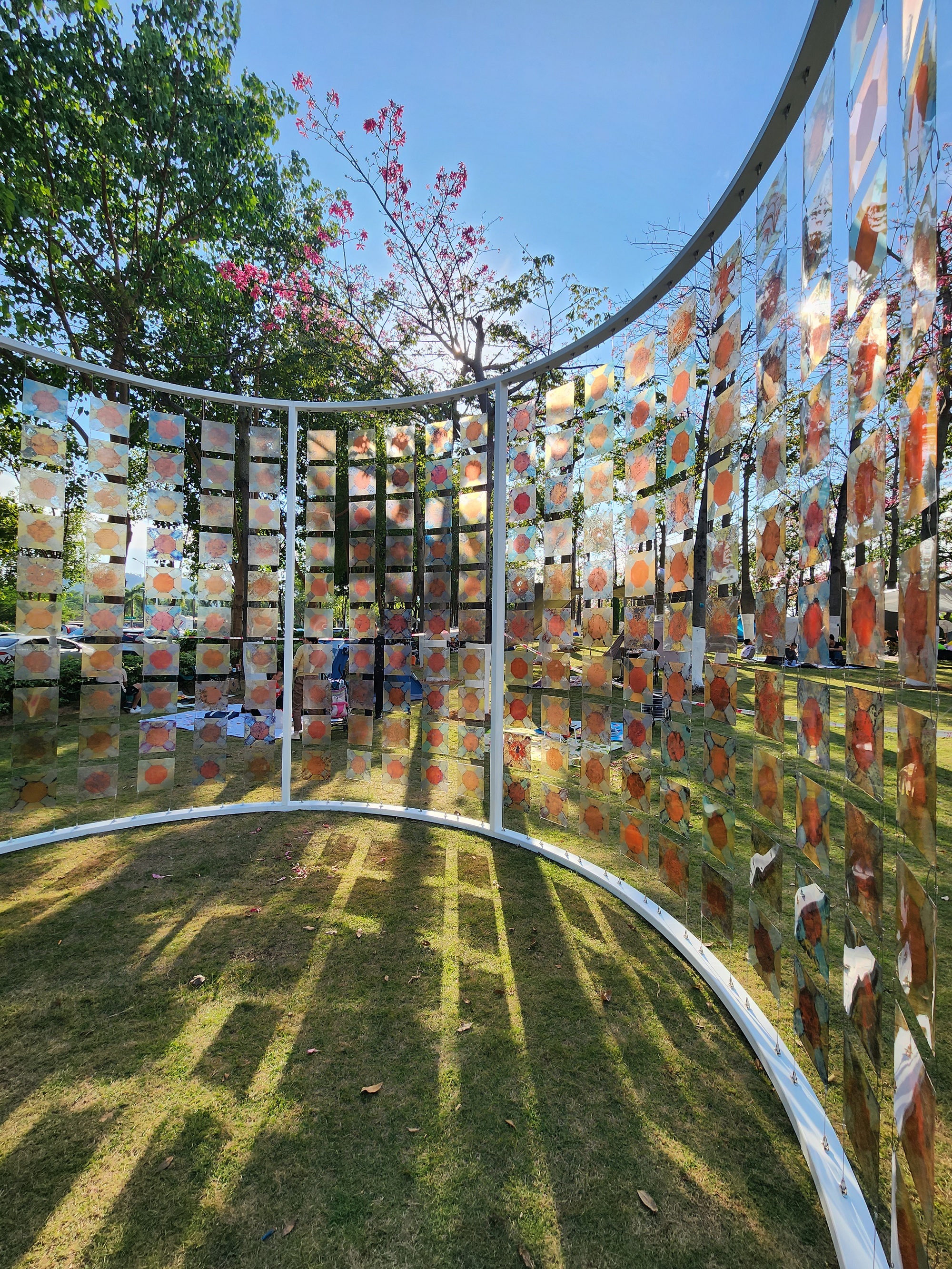 來自澳門的青年藝術家黎小傑、盧紹儀共同打造的藝術裝置在現場亮相,成為市民遊客爭相打卡的焦點。該作品以自然花卉為靈感,融合當代藝術裝置與傳統工藝,寓意“以藝為橋,以樂為心”。黎小傑、盧紹儀等在現場與市民交流創作理念,鼓勵公眾參與藝術創作,真正實現“人人都是藝術家”的共創體驗。