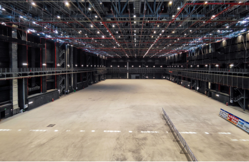 除超級水景基地外,揚州影視基地的整體建設同樣凸顯「工業化」特質。從規模來看,基地總投資達46.2億元,一期工程總建築面積約26.5萬平方米,包括19個專業攝影棚,以及綜合樓、酒店、餐飲中心等配套項目,可滿足劇組「一站式」拍攝需求。這19個影棚共組成8個組團,其中面積超3000平方米的影棚有13個,還包含1座1萬平方米攝影棚(簡稱「萬米棚」)與9000平方米室內水景拍攝中心兩大特色影棚。作為標誌性設施之一的「萬米棚」,其跨度達67.5米、總高度32.7米(相當於10層樓),實地探訪中,基地內現代化影棚「超大、超寬、超高」的特質十分突出,空間設計突破行業常規,無論是需要搭建巨型場景的科幻片,還是追求宏大場面的史詩片,都能在此找到適配的創作空間。