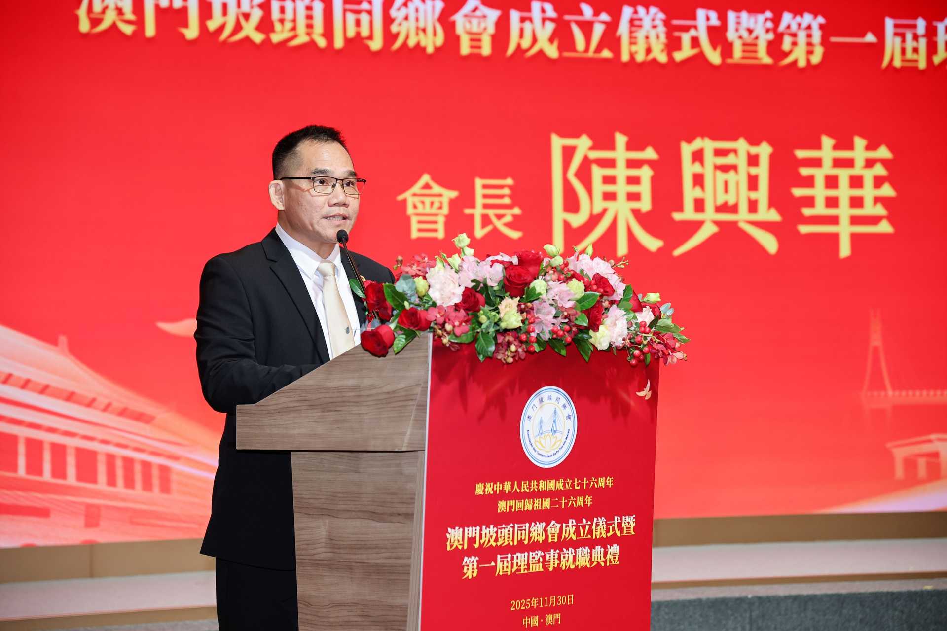 典禮在莊嚴的國歌聲中拉開帷幕。會長陳興華帶領全體理監事在各界嘉賓見證下鄭重宣誓就職。陳興華在致辭中表示,同鄉會將秉持「愛國愛澳、聯鄉聯誼」的創會宗旨,團結在澳鄉親,構建情感共同體,積極推動澳門與坡頭在文化、經貿、青年交流等領域的務實合作。易治國及劉劍分別致辭,對同鄉會的成立表示熱烈祝賀,並期待其成為連接兩地、服務鄉親、貢獻社會的重要平台。劉劍書記表示,相信在首屆理監事的帶領下,澳門坡頭同鄉會必將成為在澳鄉親的溫暖之家,成為匯聚智慧與力量的重要平台,成為促進澳坡交流合作的堅實紐帶。