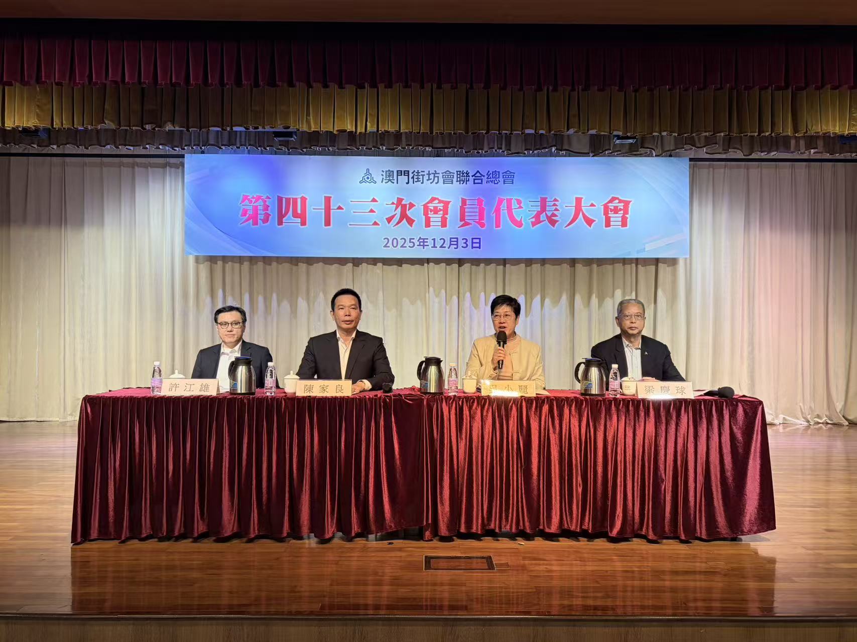 【即時新聞】澳門街坊總會今晚召開第43次會員代表大會,會上作2025年度工作回顧,並審議明年工作計劃。理事長陳家良表示,當前正值澳門上下深入學習宣傳二十屆四中全會精神,全面總結特區「二五」規劃執行情況,做好「三五」規劃工作,對接國家發展戰略的重要窗口期和戰略機遇期。相信在中央政府的堅強領導、祖國內地的大力支持、特區政府的正確帶領、社會各界的共同努力下,澳門必定能夠搶抓「十五五」規劃帶來的機遇,進一步彰顯「一國兩制」的優勢以及澳門作為國際合作平台的作用,高質量推動澳門各項事業發展。