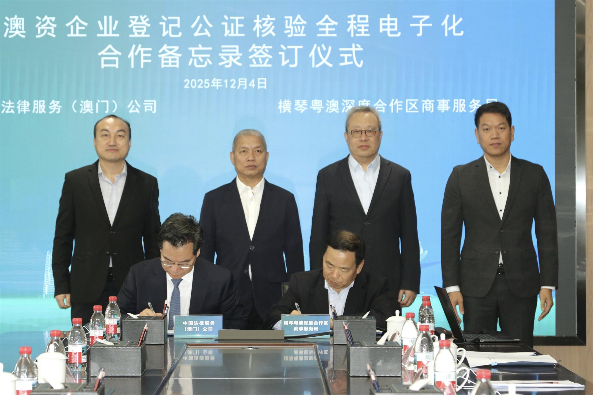 【即時新聞】橫琴粵澳深度合作區商事服務局與中國法律服務(澳門)公司今日簽署《合作備忘錄》,共同推動實施合作區澳資企業登記公證核驗全程電子化服務。此舉標誌著澳門投資者辦理合作區商事登記業務的便利化程度再獲實質性提升。