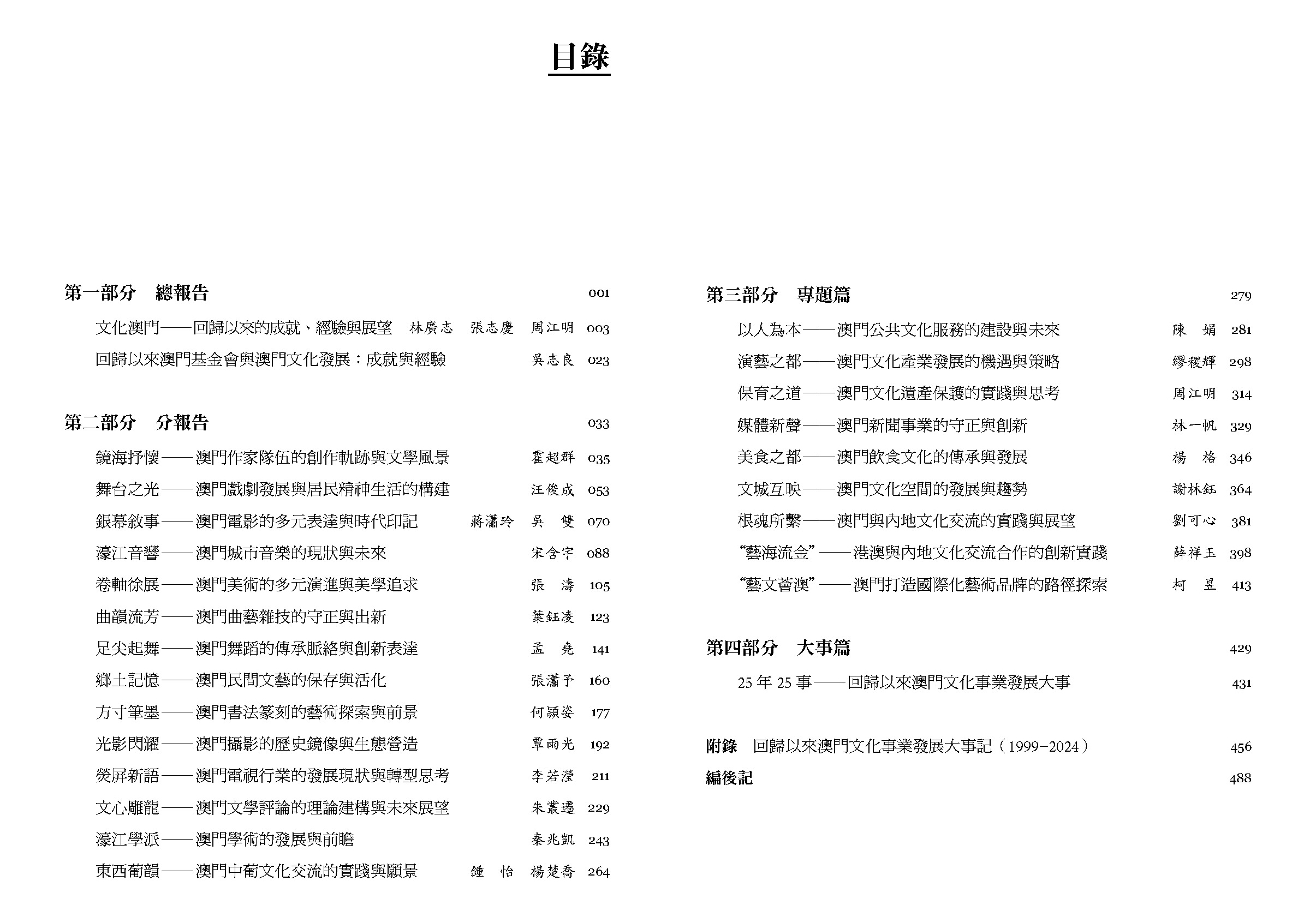 本書由澳門中國澳門學學會主編,澳門文化界聯合總會學術委員會合編,澳門科技大學社會和文化研究所、澳門科技大學人文藝術學院協編,澳門基金會贊助,香港三聯書店出版,林廣志、張志慶領銜撰寫。全書約35萬字,分為總報告、分報告、專題篇、大事篇和附錄,內容涵蓋作家隊伍、戲劇、電影、音樂、美術、曲藝雜技、舞蹈、民間文藝、書法篆刻、攝影、電視、文學評論、學術研究、中葡文化交流、公共文化服務、文化產業、文化遺產、新聞事業、飲食文化、文化空間、澳門與內地文化交流,以及“藝海流金”“藝文匯澳”等重要文化項目。該書聚焦澳門在“一國兩制”方針指引下,建設“以中華文化為主流、多元文化共存的交流合作基地”的探索歷程與實踐路徑,為澳門文化事業的未來發展提供思路和參考,還以“澳門經驗”貢獻於國家文化治理與中西文明互鑒實踐,是理解澳門文化特質及其在國家文化戰略中獨特地位的重要讀本。