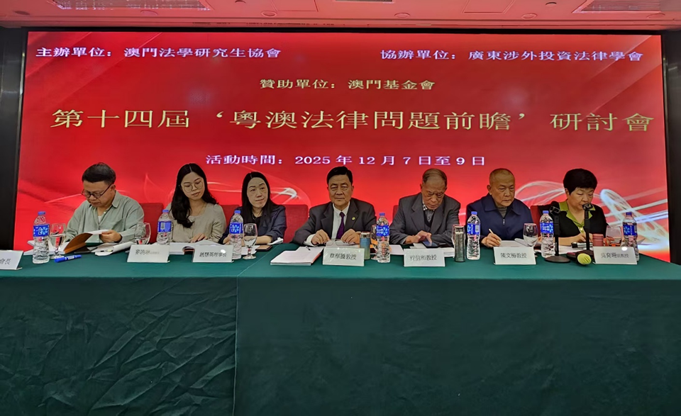 由澳門法學研究生協會主辦、廣東涉外投資法律學會協辦、澳門基金會資助的第14屆“粵澳法律問題前瞻”研討會,2025年12月7至9日在本澳順利舉行。
