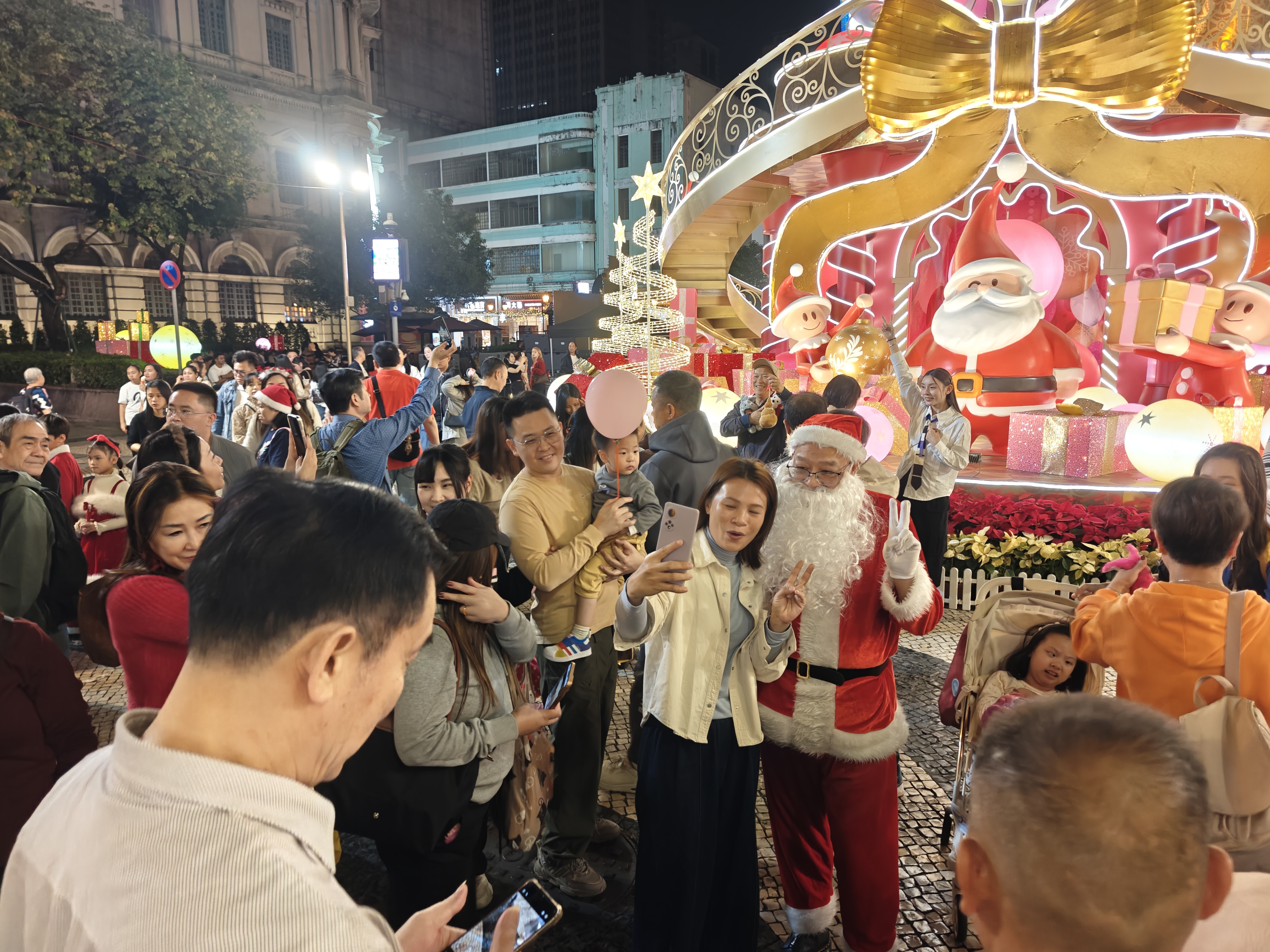 【即時新聞】今日平安夜,市面燈光璀璨,聖誕燈飾亮麗,不少市民和旅客到街上歡度佳節,中區議事亭至大三巴牌坊一帶人流如鯽,有市民旅客在聖誕燈飾之下拍照留念,亦有聖誕老人到場與途人互動,派發禮物及合照;也有宗教團體在大三巴舉辦報佳音活動,吸引大批市民和旅客坐滿牌坊梯級觀賞,處處洋溢著濃濃的聖誕氣氛。