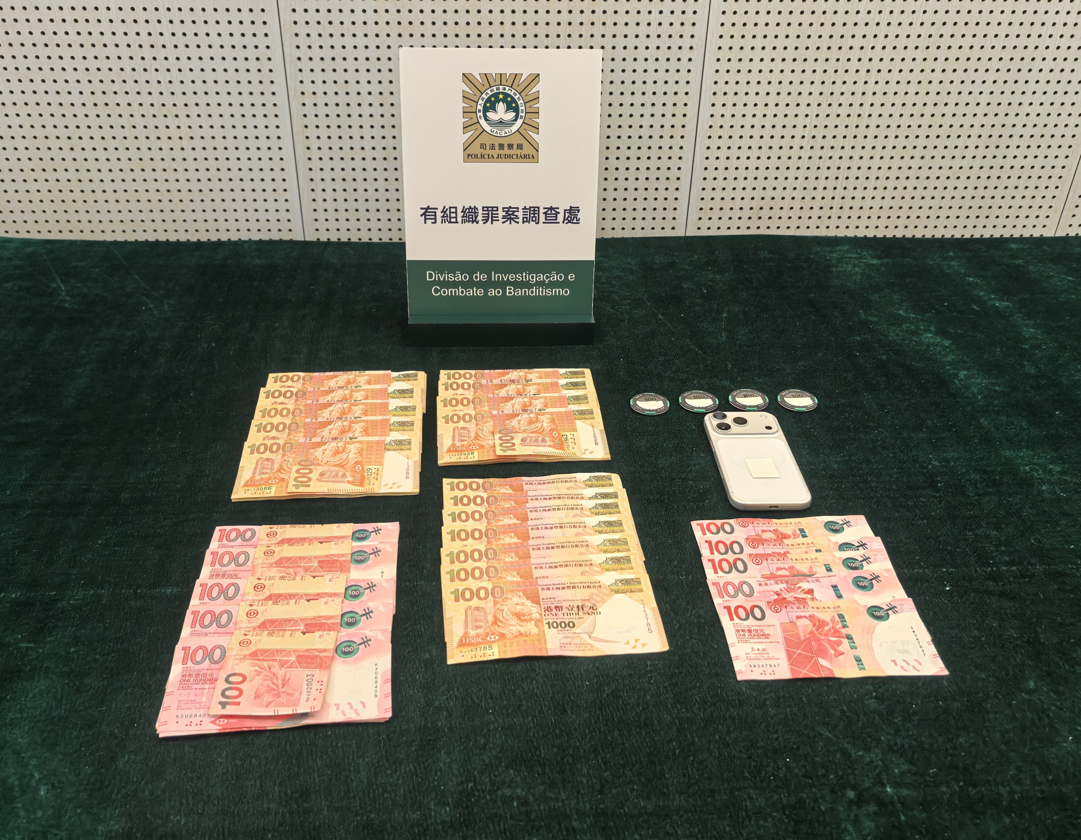 【即時新聞】司警偵破一宗以保健品店為掩護的不法匯兌案件,拘捕一名本地男子,檢獲102,500港元現金及四個面值100港元的籌碼。