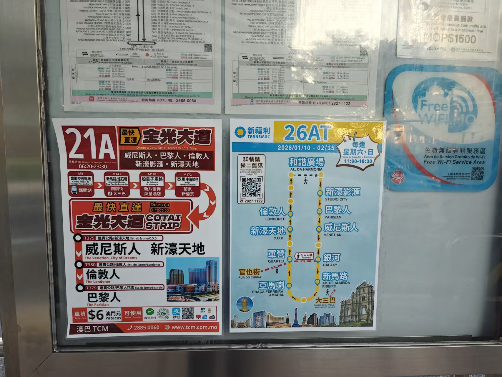 據悉,21AT為循環路線,由本月10日起至2月8日期間逢週六、日營運,營運時間為上午10時至晚上7時,班次頻率為10至20分鐘一班,從「媽閣交通樞紐」站出發,途經「新馬路/爐石塘」站、「殷皇子馬路」站、「亞馬喇前地」站、「連貫公路/新濠影匯」站、「連貫公路/巴黎人」站、「連貫公路/威尼斯人」站、其後返回「亞馬喇前地」站、「中區/殷皇子馬路」站及「媽閣交通樞紐」站;26AT同樣為循環路線,於本月10日起至2月15日期間逢週六、日營運,營運時間上午11時至下午6時半,班次頻率為15至30分鐘一班,由 「和諧廣場/樂群樓」站發車,途經「連貫公路/新濠影匯」站、「連貫公路/巴黎人」站、「連貫公路/威尼斯人」站、「望德聖母灣馬路/連貫公路」站、「排角/銀河」站、「新馬路/爐石塘」站、「殷皇子馬路」站、「亞馬喇前地」站、「望德聖母灣馬路/軍營」站、「望德聖母灣馬路/紅樹林」站、「連貫公路/新濠天地」站、「連貫公路/倫敦人」站、「連貫公路/巴黎人花園」站、「蓮花圓形地」站及「和諧廣場/業興大廈」站。