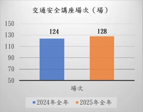 五、交通宣傳教育在宣傳教育方面,治安警持續派員前往社區、校園及運輸團體,為廣大市民舉辦一系列交通安全宣傳活動,於2025年,治安警交通廳共舉辦128場交通安全講座,共約12,218人次參與,較2024年全年124場11,412人次上升3.23%及7.06%。