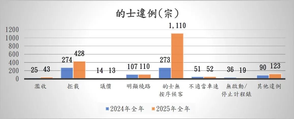 三、的士違例及“白牌車”2025年全年,治安警共檢控1,898宗的士違例個案,當中包括濫收43宗、拒載428宗、議價13宗、明顯繞路110宗、的士站無按序候客1,110宗、不適當車速52宗、無啟動/停止計程錶19宗及其他違例123宗,較2024年全年檢控的士違例870宗上升118.16%,包括濫收25宗上升72%、拒載274宗上升56.2%、議價14宗下降7.14%、明顯繞路107宗上升2.8%、的士無按序候客273宗上升306.59%、不適當車速51宗上升1.96%、無啟動/停止計程錶36宗下降47.22%及其他違例90宗上升36.67%。