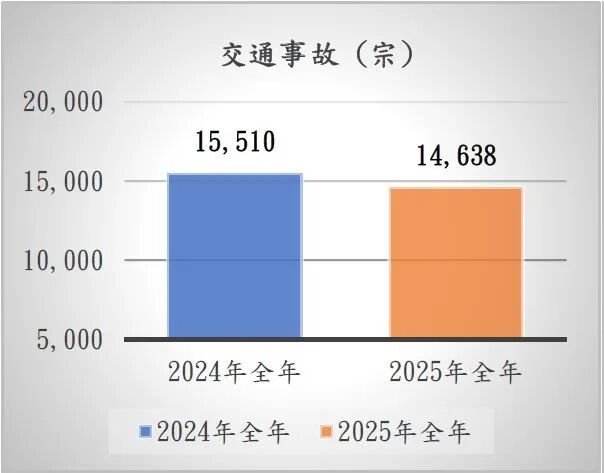 一、交通事故2025年全年,治安警察局共錄得交通事故14,638宗,較2024年全年15,510宗下降5.62%,當中交通事故主要成因首三項分別為:沒有保持適當距離3,087宗,未能控制車速2,024宗及轉向不小心1,892宗,較2024年全年沒有保持適當距離3,169宗下降2.59%、未能控制車速2,050宗下降1.27%及轉向不小心1,829宗上升3.44%。