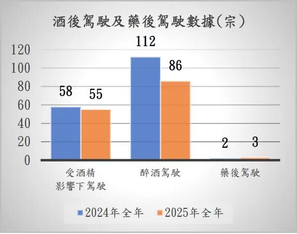 二、酒後駕駛及藥後駕駛2025年全年,酒後駕駛行為合共有141宗,較2024年全年170宗下降17.06%,當中觸犯“醉酒駕駛”罪(體內每公升血液酒精含量等於或超過1.2克)共有86宗,較2024年全年112宗下降23.21%;受酒精影響下駕駛(每公升血液中酒精含量超過或等於0.5克及低於1.2克)共有55宗,較2024年全年58宗下降5.17%;藥後駕駛共有3宗,較2024年全年2宗上升50%。