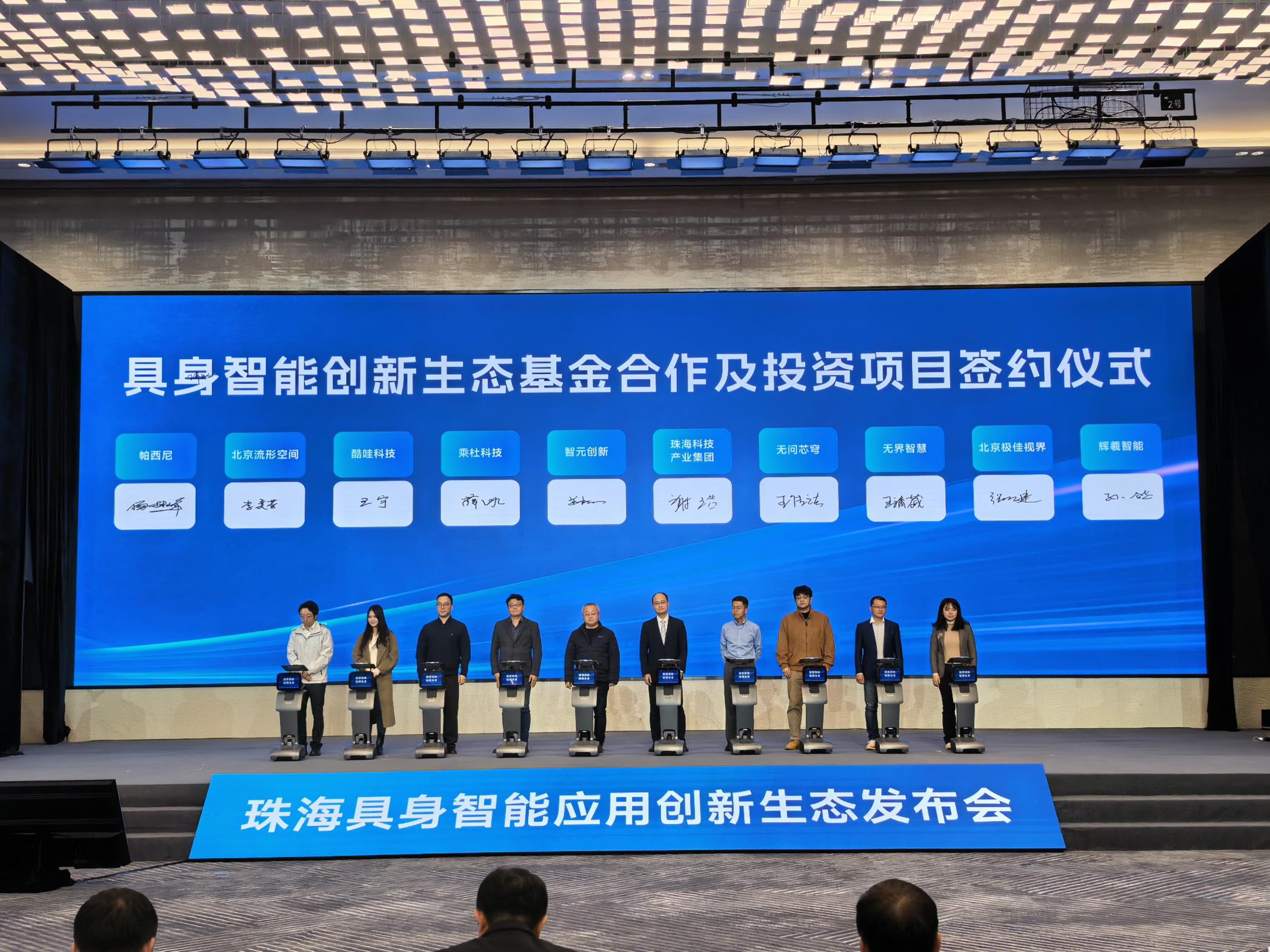 發佈會現場,一系列扎實合作同步落地:珠海水控集團、華發物業、北理工附屬實驗學校等需求方與傑創智能等供應商簽約;華潤微電子、傲意科技、無問芯穹、智譜、酷哇科技、千尋智能、智澄AI、乘杜科技、帕西尼等二十餘家產業鏈頭部企業與珠海科技產業集團就共同建設珠海具身智能應用創新生態進行簽約;珠海科技產業集團與智元創新(上海)科技股份有限公司聯合發起設立具身智能創新生態基金。