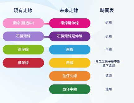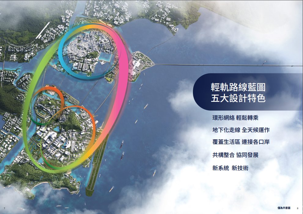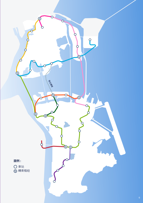 介紹文本指出,輕軌路線藍圖具有五大設計特色,新路線將與現有路線共同構建成環形網絡,未來東線、西線與現有氹仔線互相對接組成外環,並可透過轉乘進入內環的南線、氹仔中線及氹仔北線,為市民及旅客提供更多出行選擇,能更快捷地抵達目的地,大幅縮短跨區行 程,同 時 有 效 緩 解 半 島 舊 城 區 和 各跨海大橋的交通壓力,提升城市交通出行效率。
