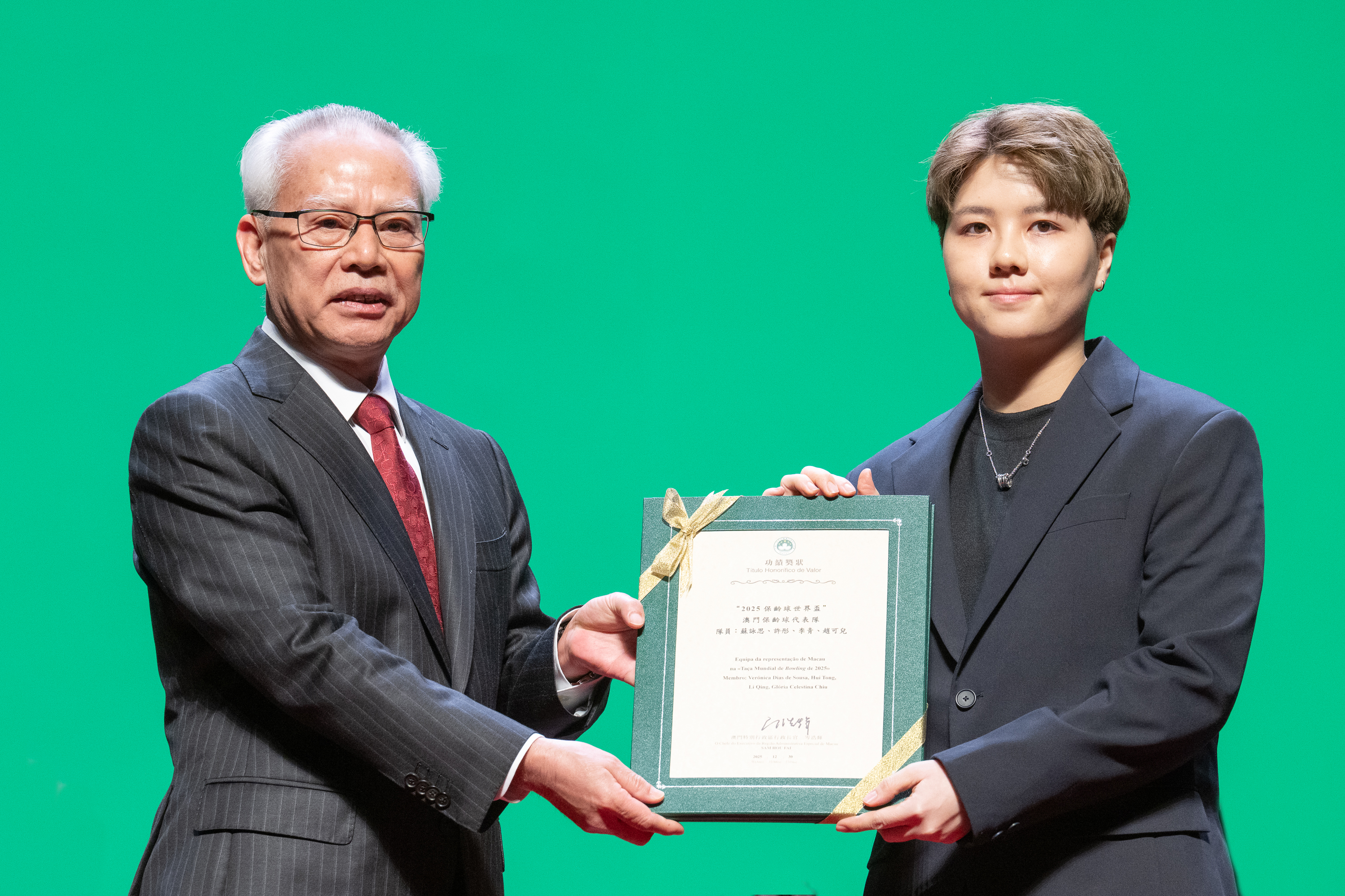 【即時新聞】2025年度勳章、獎章及獎狀頒授儀式今日在文化中心舉行,由蘇詠思、許彤、李青及趙可兒組成的澳門保齡球女子代表隊,憑藉在2025年初保齡球世界盃斬獲歷史首面銅牌,獲特區政府頒授功績獎狀,實至名歸。