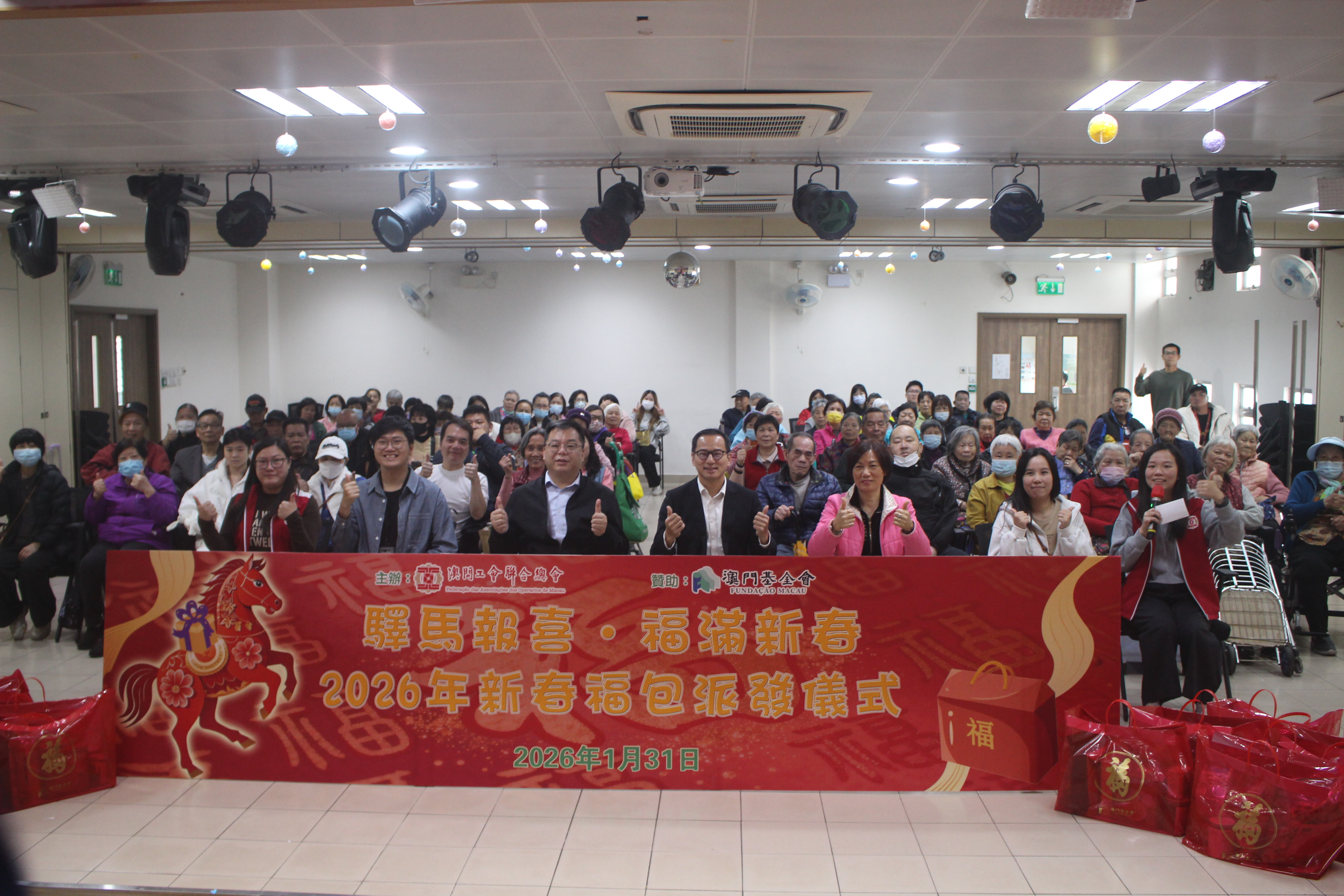 【即時新聞】工聯總會在澳門基金會資助下,今日上午11時在工聯台山社區中心舉行“2026新春福包派發儀式”,向屬下八個系統工會及多個服務機構的獨居長者、長期病患、殘疾人士及特貧職工等弱势社群致送新春福包,共惠及1,226個家庭。