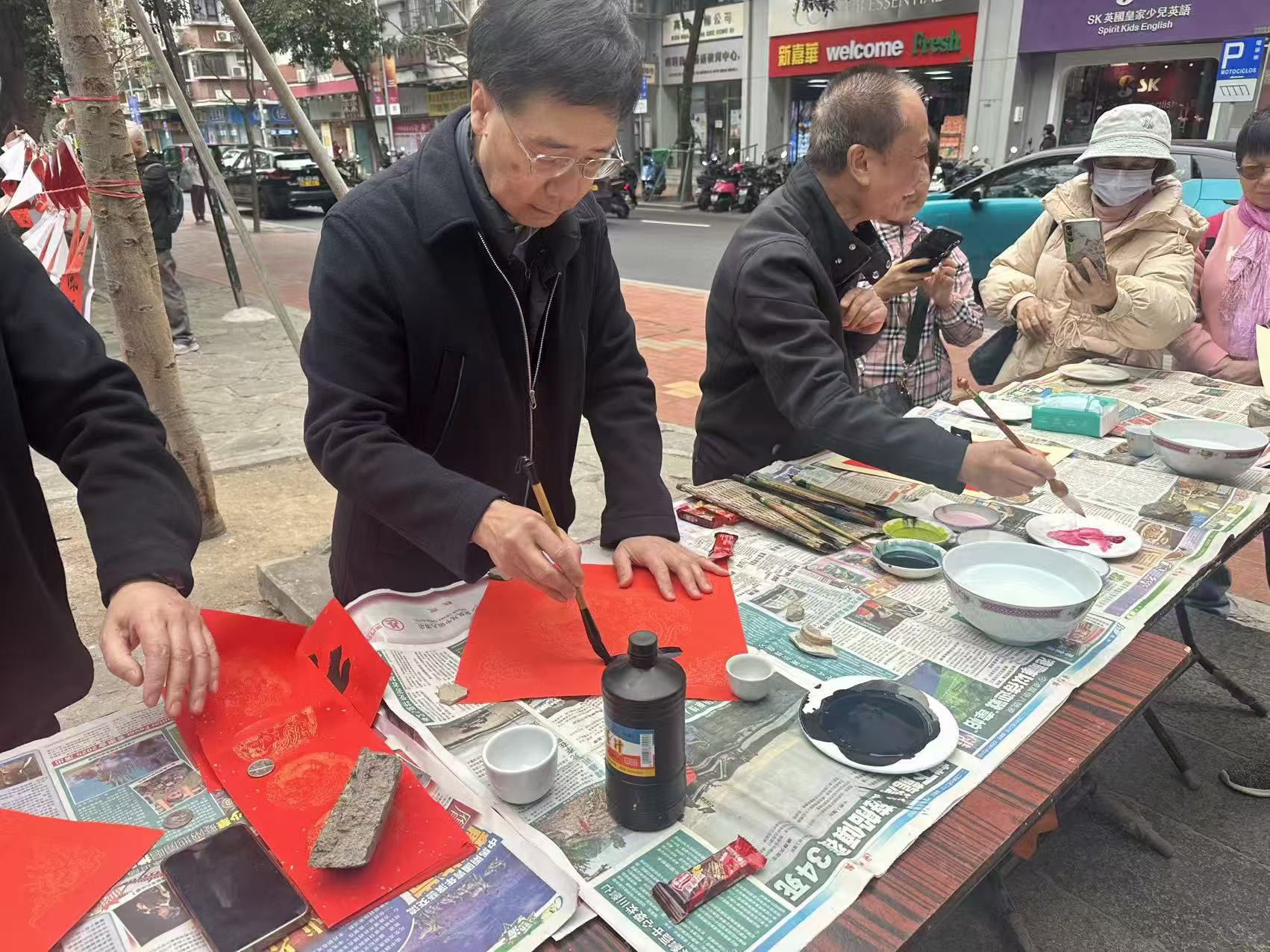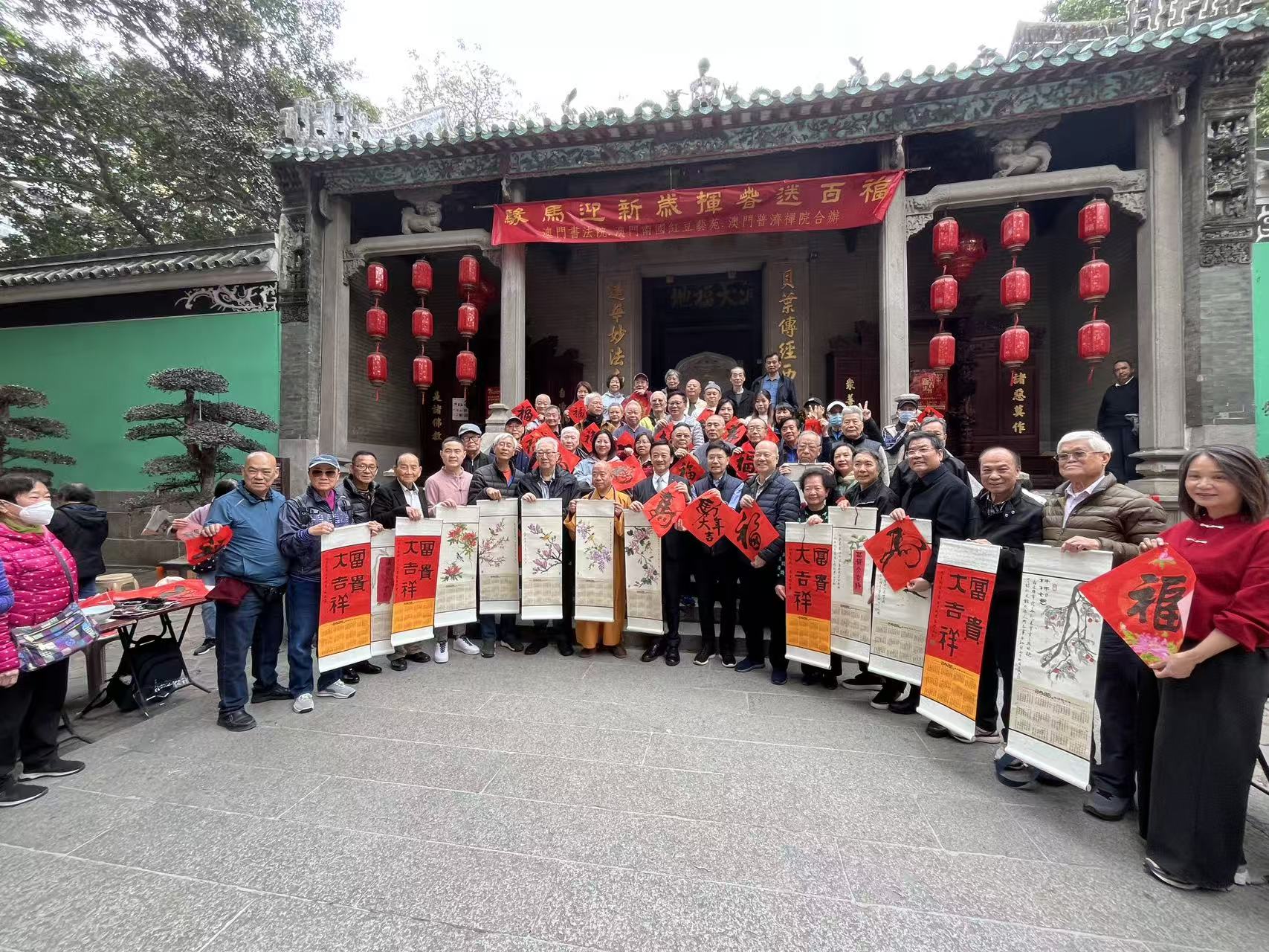 【即時新聞】由澳門書法院、南國紅豆藝苑及澳門普濟禪院聯合主辦的“駿馬迎新歲 揮春送百福”活動,今日下午二時半假普濟禪院(觀音堂)門口舉行,邀請多名本澳書畫界人士參加,為街坊書寫揮春、馬字、福字及對聯等,喜迎馬年。