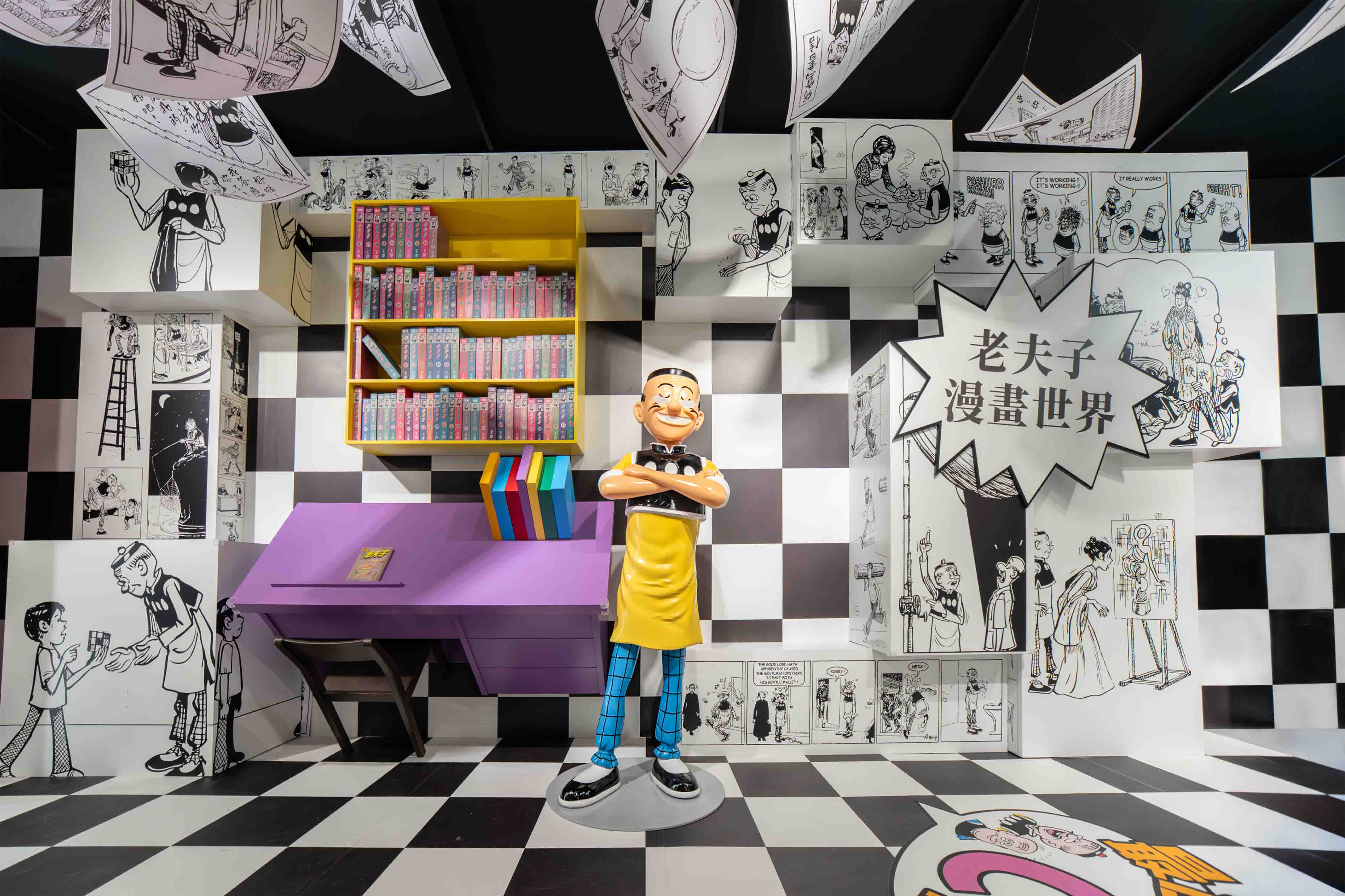融合澳門本土特色元素的「漫葡街市」,通過場景與漫畫相結合,引領賓客在輕鬆漫步中,體驗老夫子走進澳門舊日的景象。而「60新出色畫廊」則把展覽視角延伸至藝術與潮流領域。從經典黑白四格,到色彩斑斕的普普藝術,再到與當今潮流文化聯乘的全新創作,多元風格在此匯聚。現場更設有「穿越老夫子」互動打卡體驗,賓客可自由選擇不同角色造型及場景拍照留念,親身成為漫畫世界的一部分。