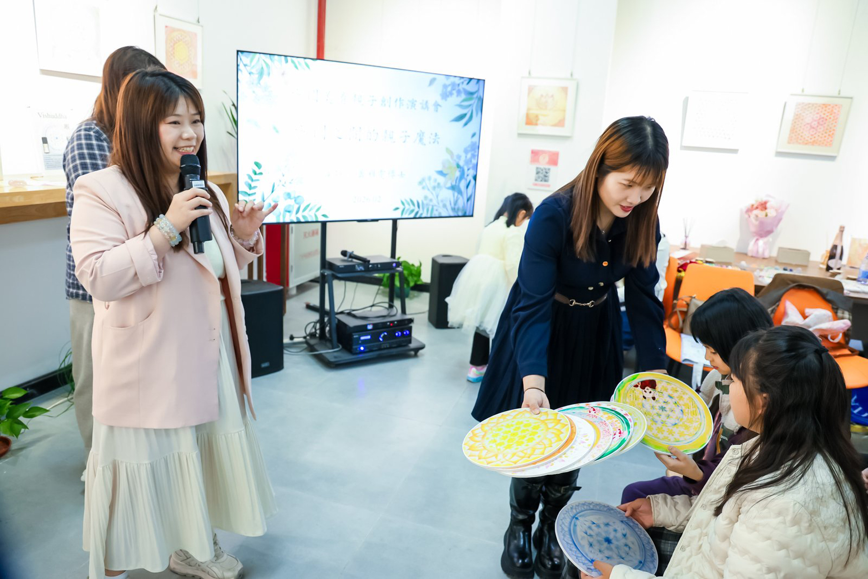 活動在展覽剪綵儀式後正式展開。美育專家蕭雅雯帶來主題演講「方圓之間的美育魔法」,以深入淺出的方式說明「方」與「圓」所蘊含的哲學思維與教育智慧,並結合展覽精神,引導家長與孩子攜手創作,將抽象的美學理念轉化為一幅幅充滿情感連結與家庭默契的藝術作品。