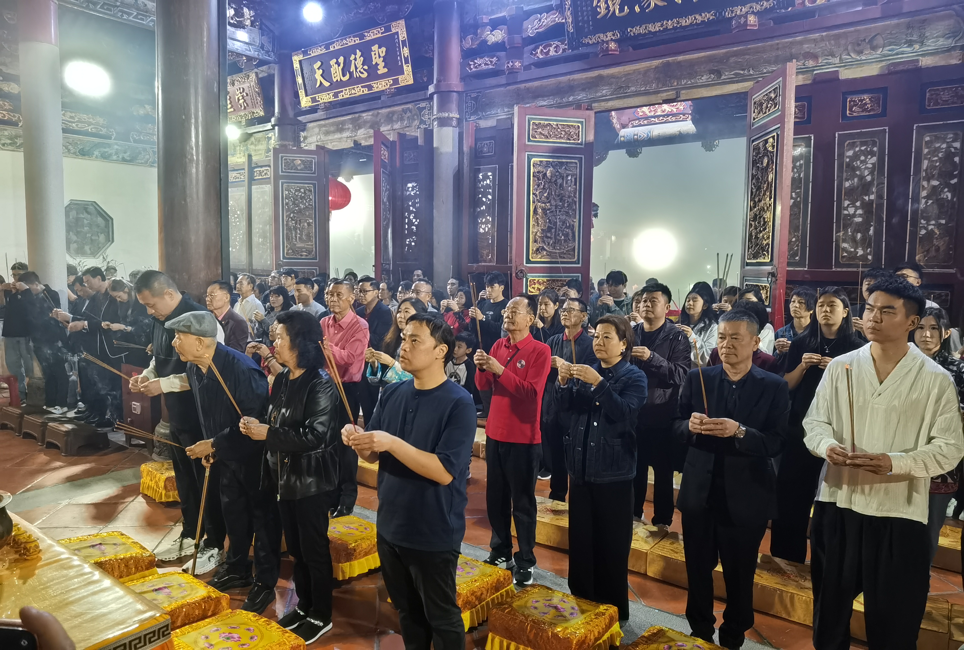 澳門中華媽祖基金會主席顏延齡聯同立法議員顏奕恆、陳禮祺、澳門中華媽祖基金會董事吳聯盟、陳明確、顏奕真、顏奕萍、黃天松、吳錫琛、吳三明、黃宗輝、顏奕賢、潘春福、副監事長劉秀珍、澳門中華媽祖基金會諮委會主席莊麗華、委員李少群、施志伴、洪文華、陳抱治、陳遠培、黃琪華、許永富、顏奕嘉、陳啟候等與眾善信齊齊向上天聖母行上香禮、三跪九叩禮及獻花、獻果、獻財帛儀式。在簡單而隆重的儀式過後,澳門中華媽祖基金會眾負責人與善信過平安橋,敲平安鐘、擊平安鼓,祈求風調雨順、國泰民安、市民安居樂業、闔家平安、福慧雙至。昨晚,警方派員在場駐守,並配合廟方人員一起維持秩序。