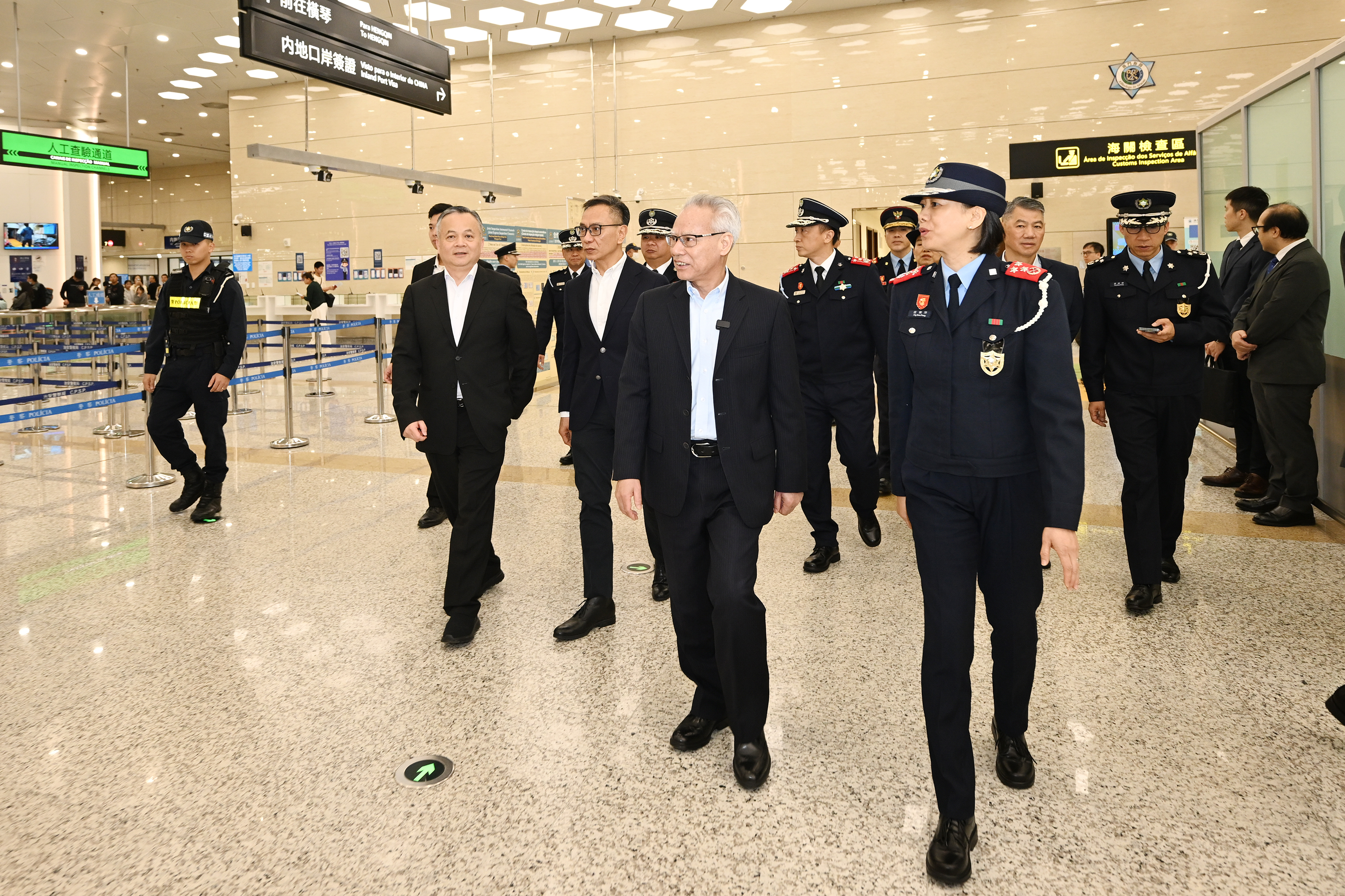 最後,岑浩輝抵達橫琴口岸視察離境大廳及汽車通道,先後聽取治安警察局代局長伍素萍、保安部隊事務局局長劉運嫦、海關助理關長葉華釗的口岸工作匯報,瞭解節假日期間的口岸通關情況、人潮管制方案、“刷臉”智能通關運作及擴建通道規劃、車道貨檢和旅客通關查驗等各項工作安排。