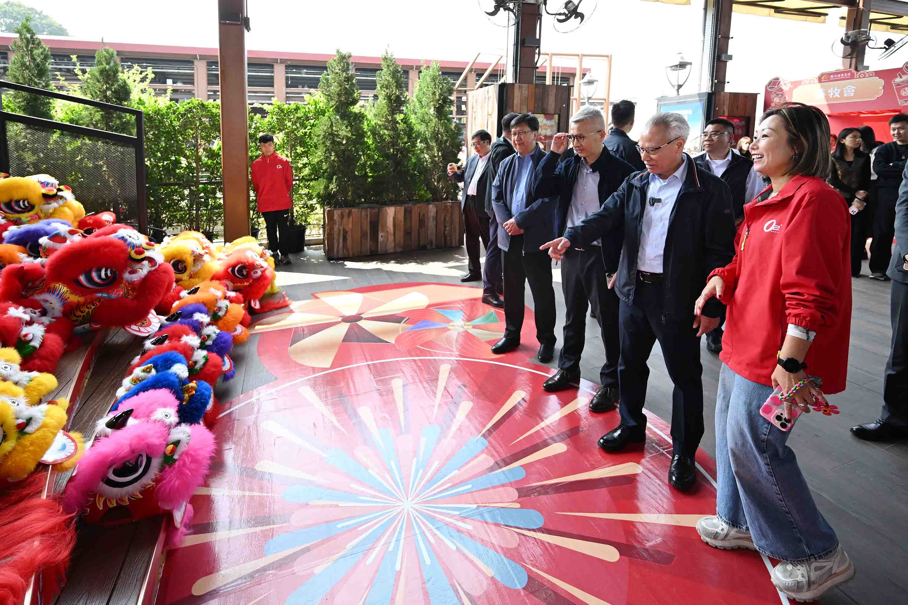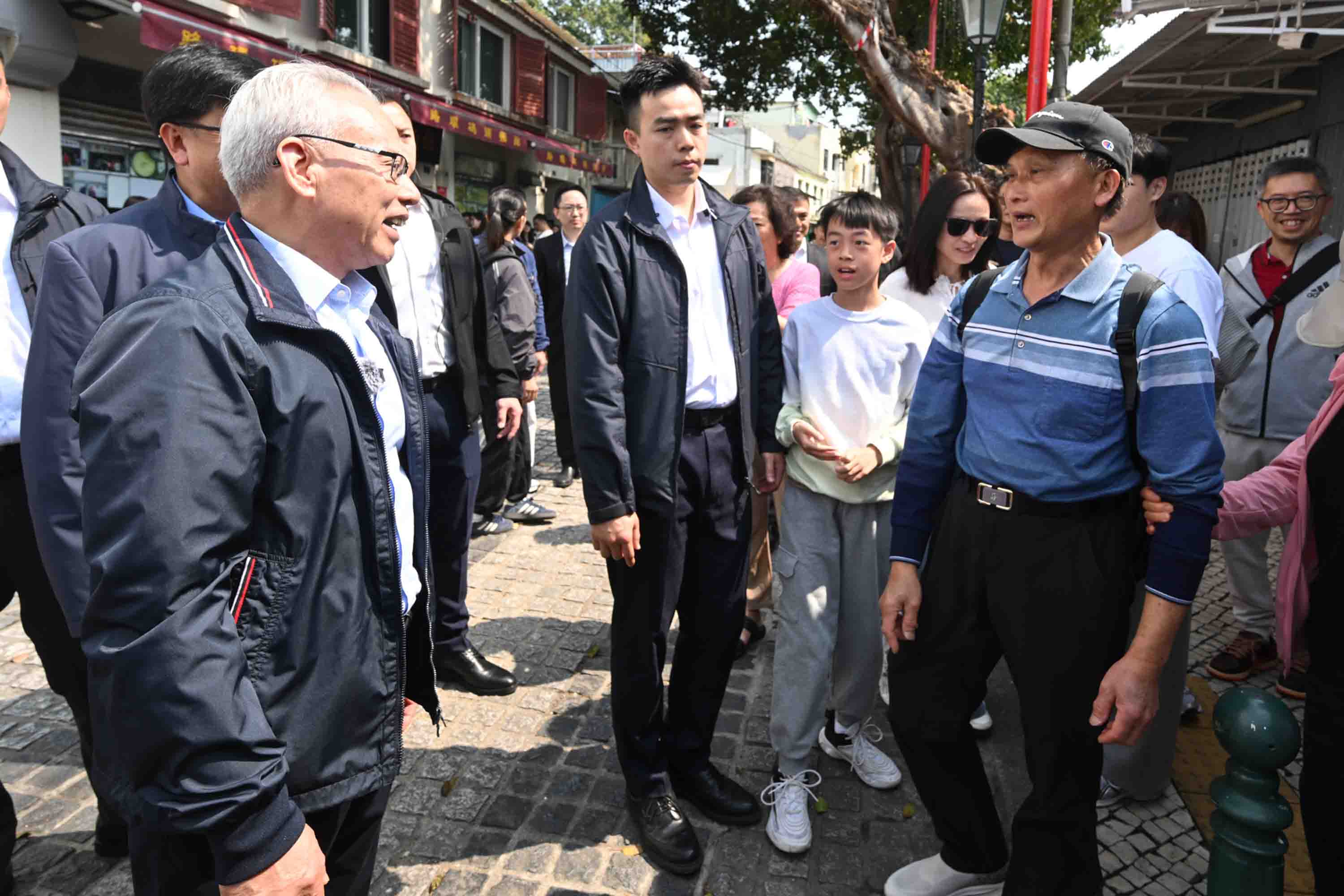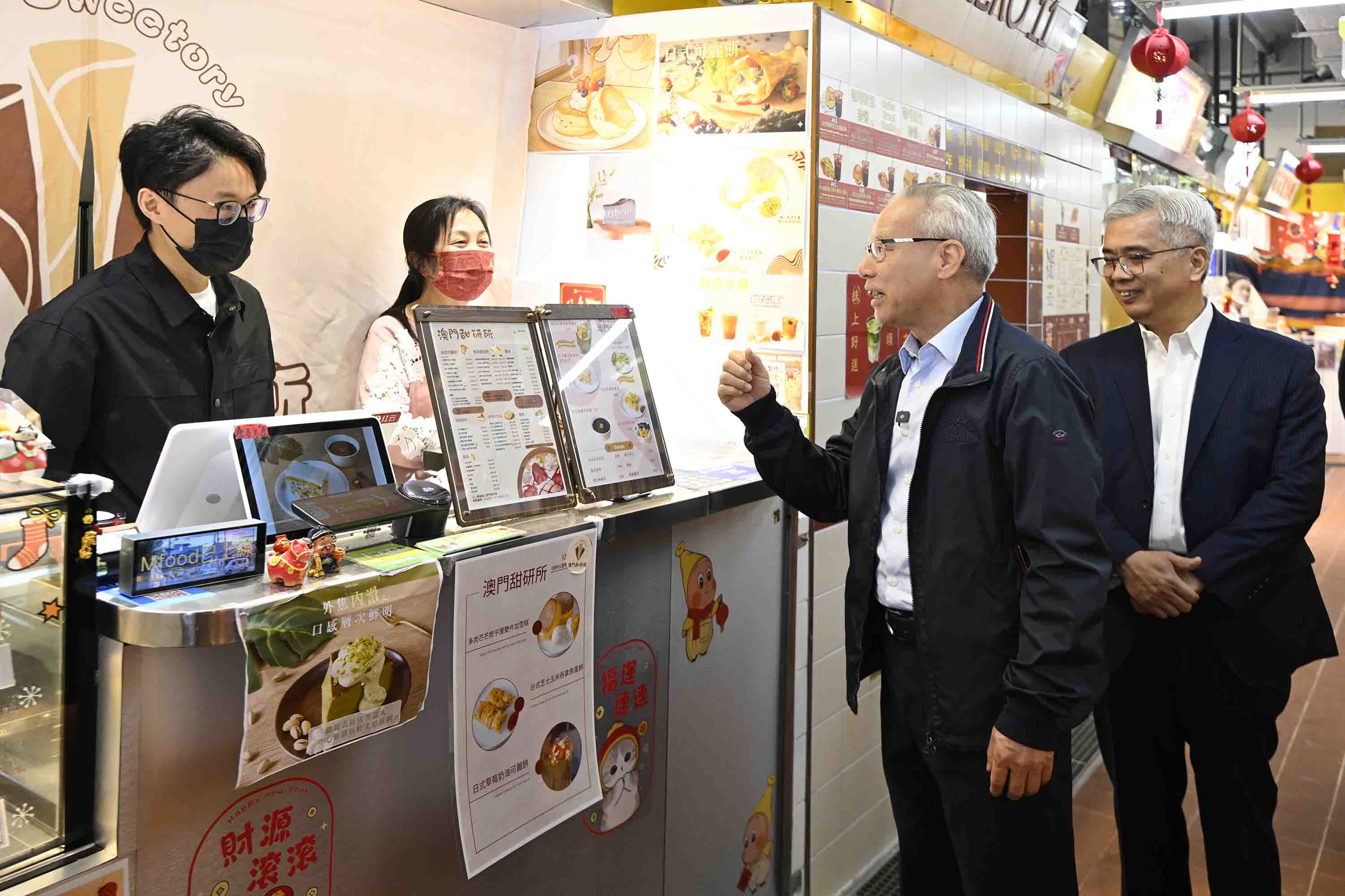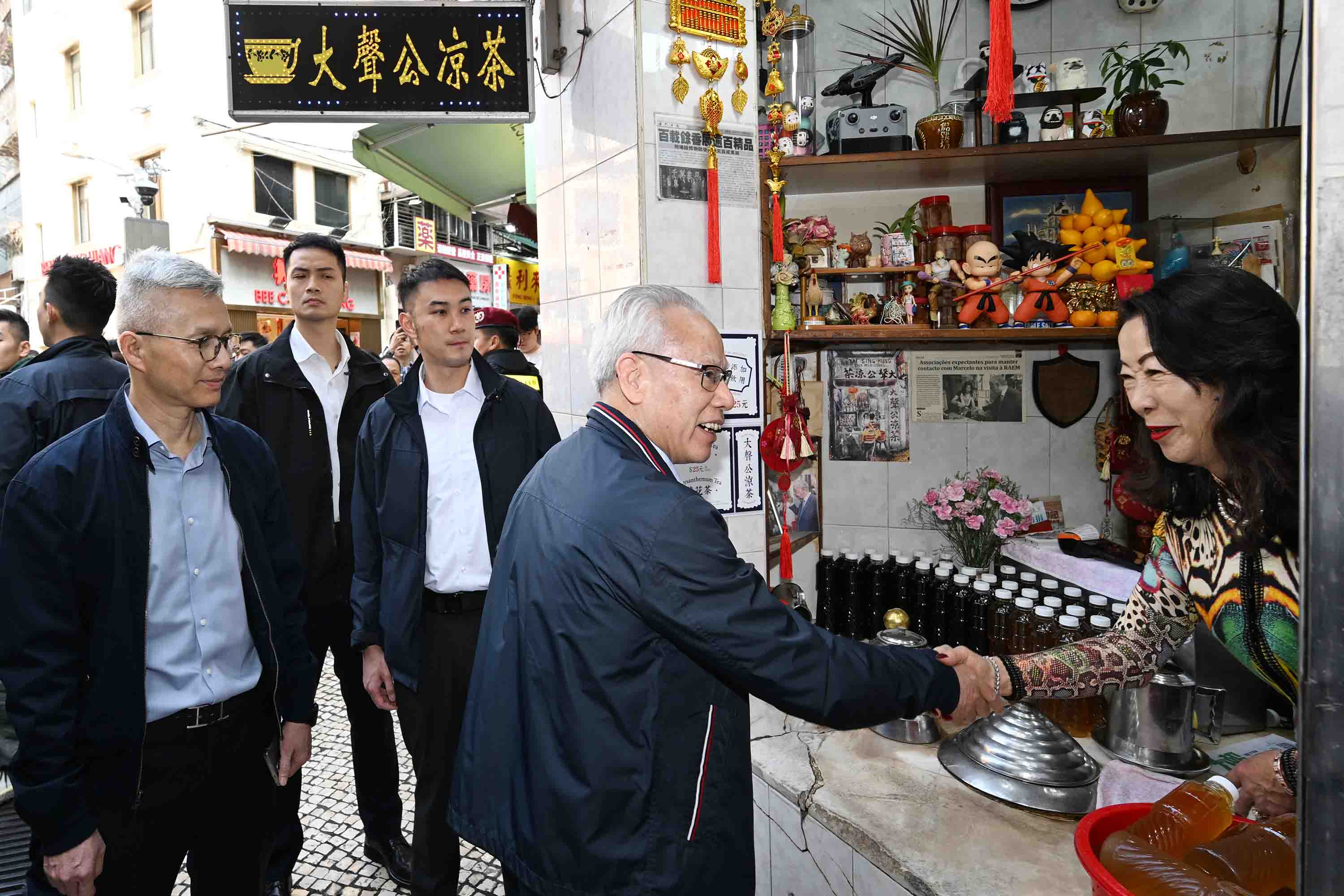 岑浩輝隨後轉往氹仔,在行政法務司司長黃少澤陪同下,視察經整治優化後的氹仔街市。他與檔主親切交談,瞭解新環境對日常經營帶來的改善與效益;他又到訪街市內新設的“美食+文創區”,聽取有關推動傳統街市轉型和可持續發展措施的介紹。岑浩輝其後與戴建業探訪氹仔舊城區一帶的商戶,瞭解新春期間和平日的營商狀況。