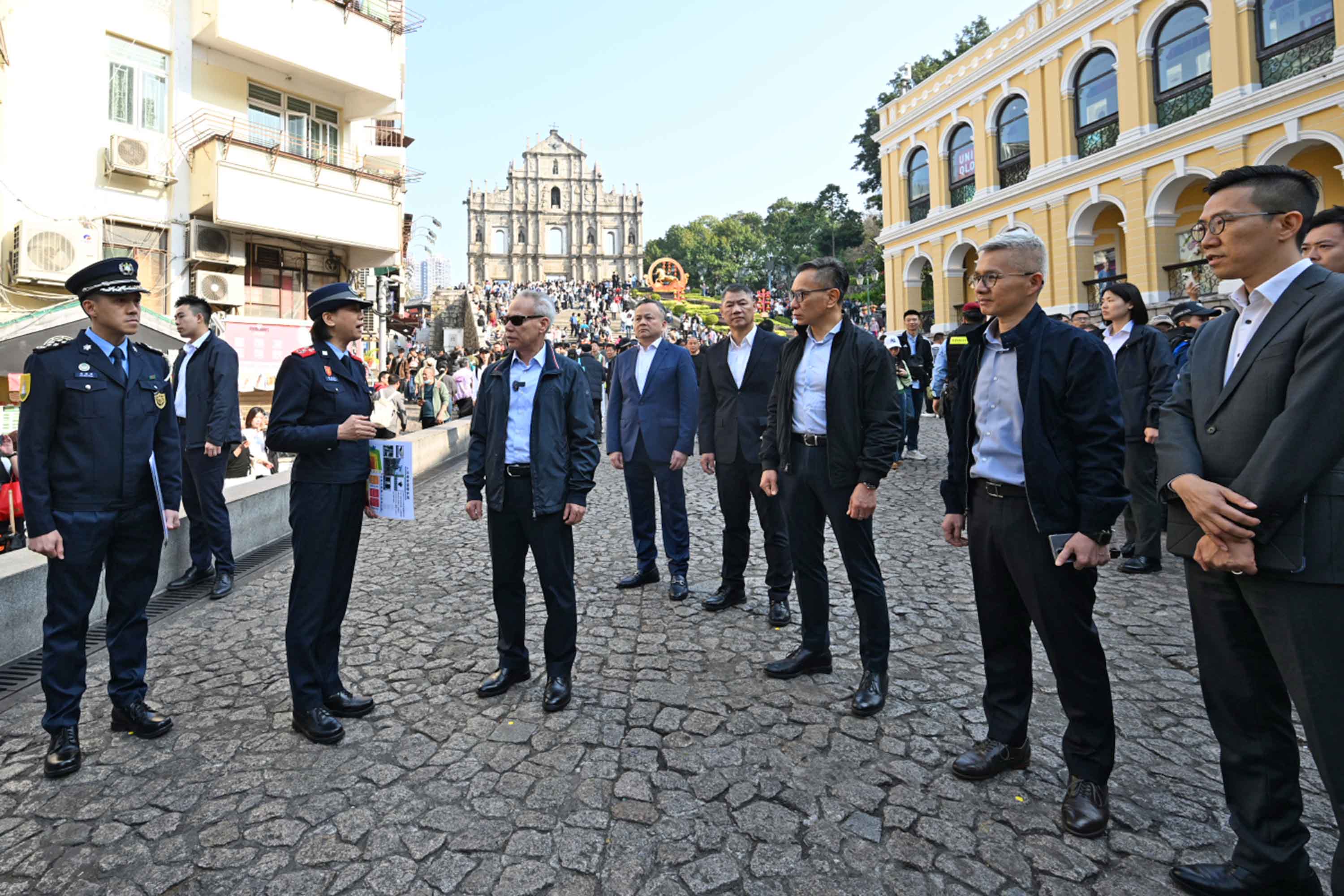 上午,岑浩輝在經濟財政司司長戴建業、保安司司長陳子勁、警察總局局長梁文昌及海關關長何浩瀚等陪同下,先後視察大三巴街、賣草地街、板樟堂街及議事亭前地一帶,聽取有關人潮管制措施的應變部署,並慰問現場執勤的前線警員,感謝他們在節日期間堅守崗位、辛勤付出。他表示,警方在人潮管制方面經驗豐富,相關措施行之有效,配合整體警務安排,有效確保市民及旅客在澳安心歡度佳節。
