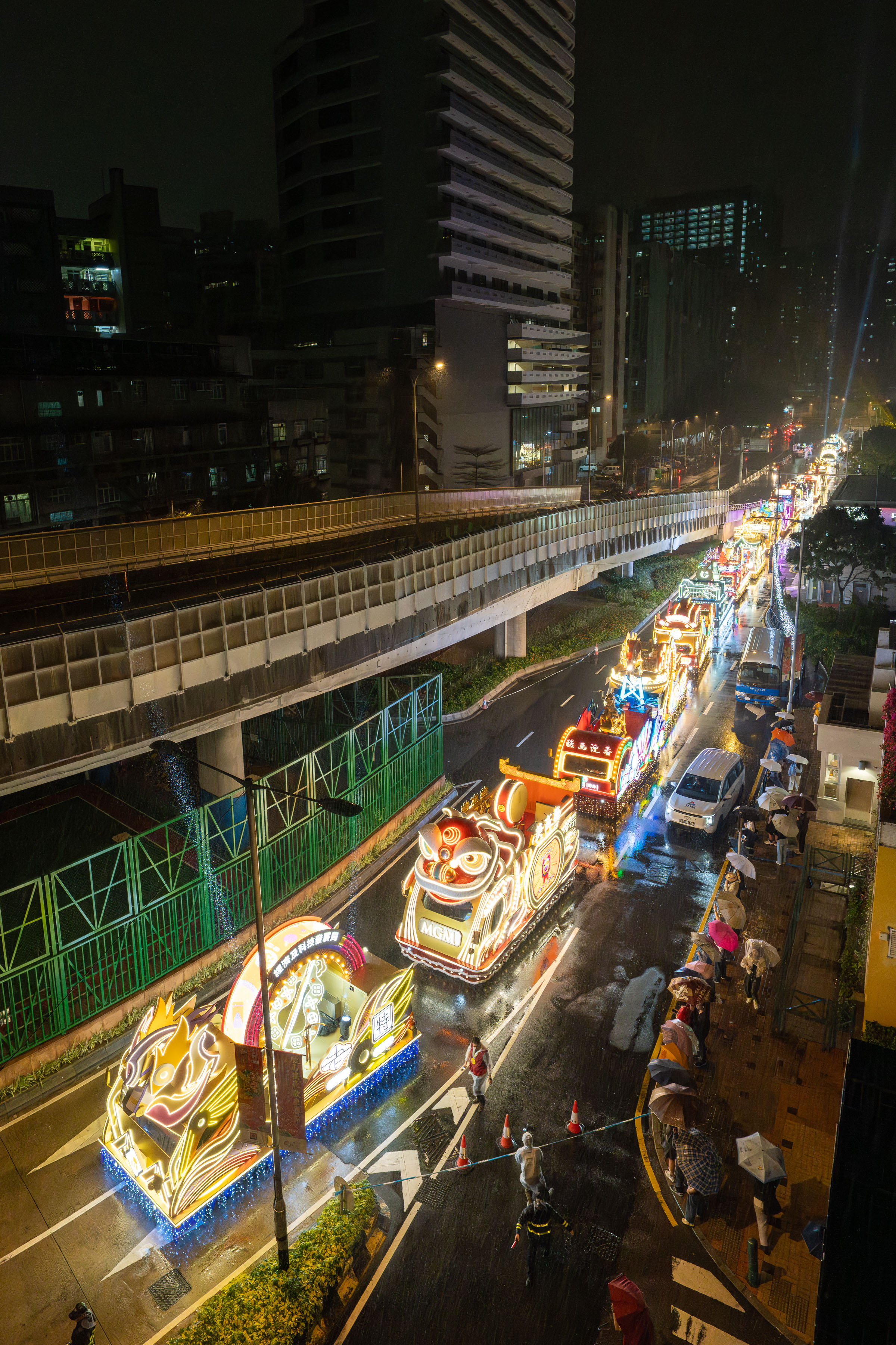 今年的花車分別由旅遊局、亞洲旅遊交流中心、市政署、經濟及科技發展局、招商投資促進局、文化局、體育局、橫琴粵澳深度合作區經濟發展局、美高梅、金沙中國有限公司、澳娛綜合度假股份有限公司、澳門永利渡假村、銀河娛樂集團、保誠保險有限公司(澳門分行)、新濠博亞娛樂、萬國控股集團及中國人壽(海外)股份有限公司澳門分公司提供。