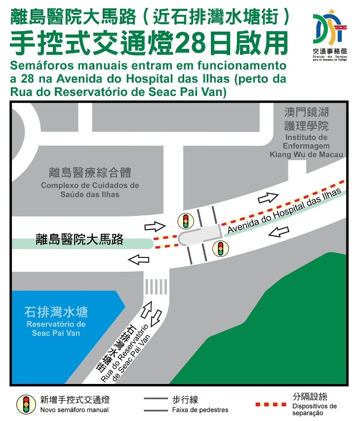 【即時新聞】經綜合分析離島醫療綜合體周邊道路的交通條件以及平衡行人和駕駛者的需要,保障人車通行安全,交通事務局於離島醫院大馬路近石排灣水塘街交界處,增設分段手控式交通燈設備,以優化行人往返離島醫療綜合體及石排灣住宅群的過路條件,相關設施將於28 日(周六)上午啟用。