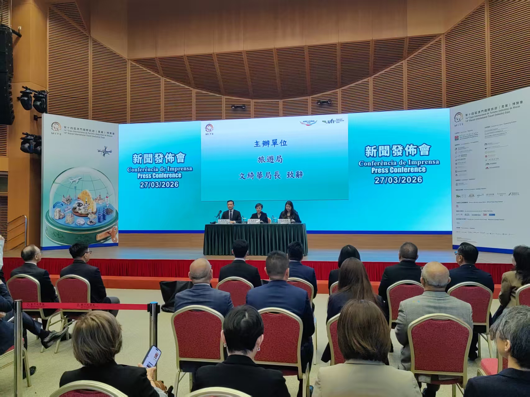 旅遊局聯同澳門旅行社協會下午四時三十分假科學館舉行新聞發佈會,旅遊局局長文綺華、副局長司徒琳麗及澳門旅行社協會會長劉雅煌等出席,介紹展會亮點與配套安排。第十四屆旅博會由國家文化和旅遊部、中聯辦及外交公署支持。